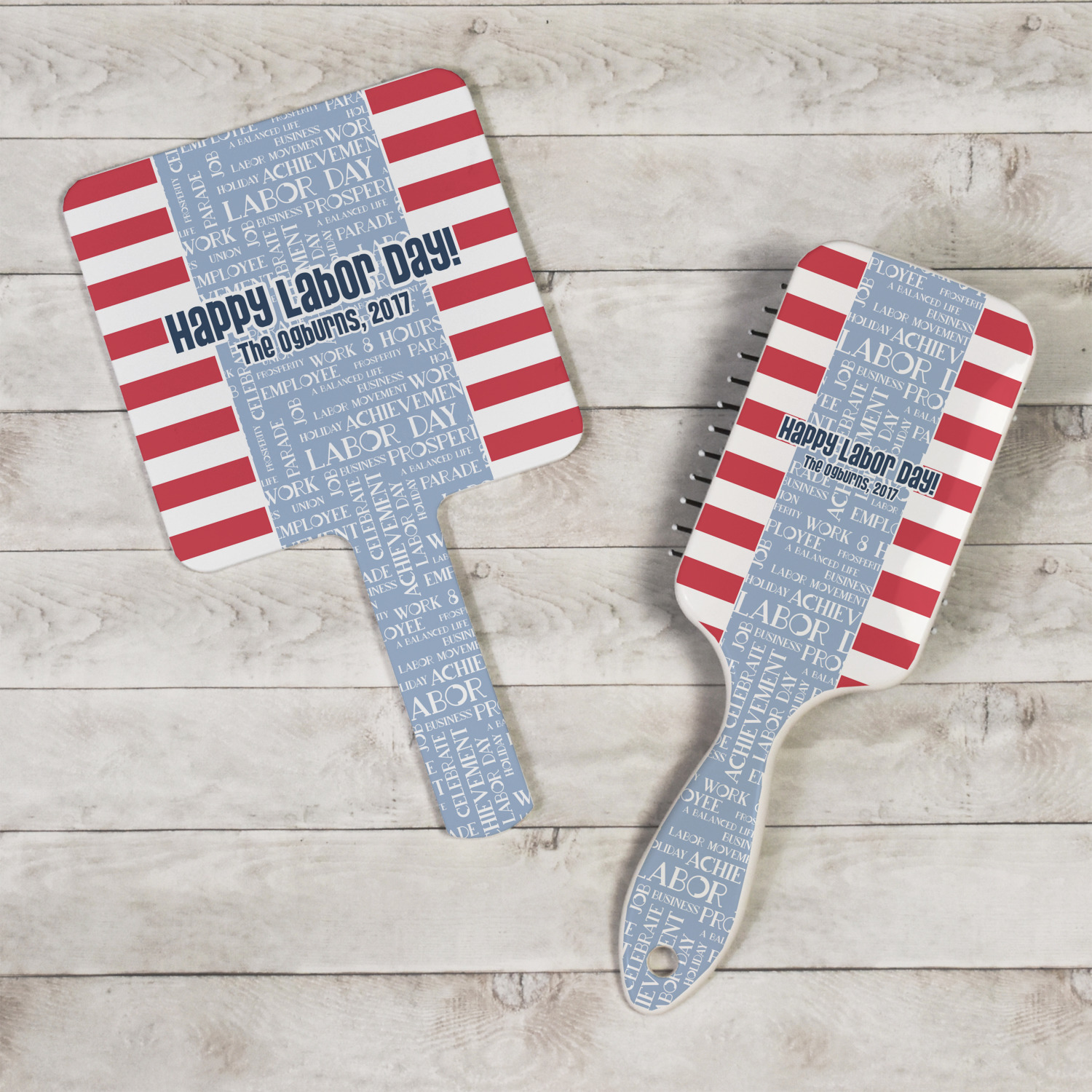 A fun red, white, and blue Labor Day badge is used in the coordinating part of the design. There are two different kinds of fonts used. One in the word cloud and one used in the personalization.