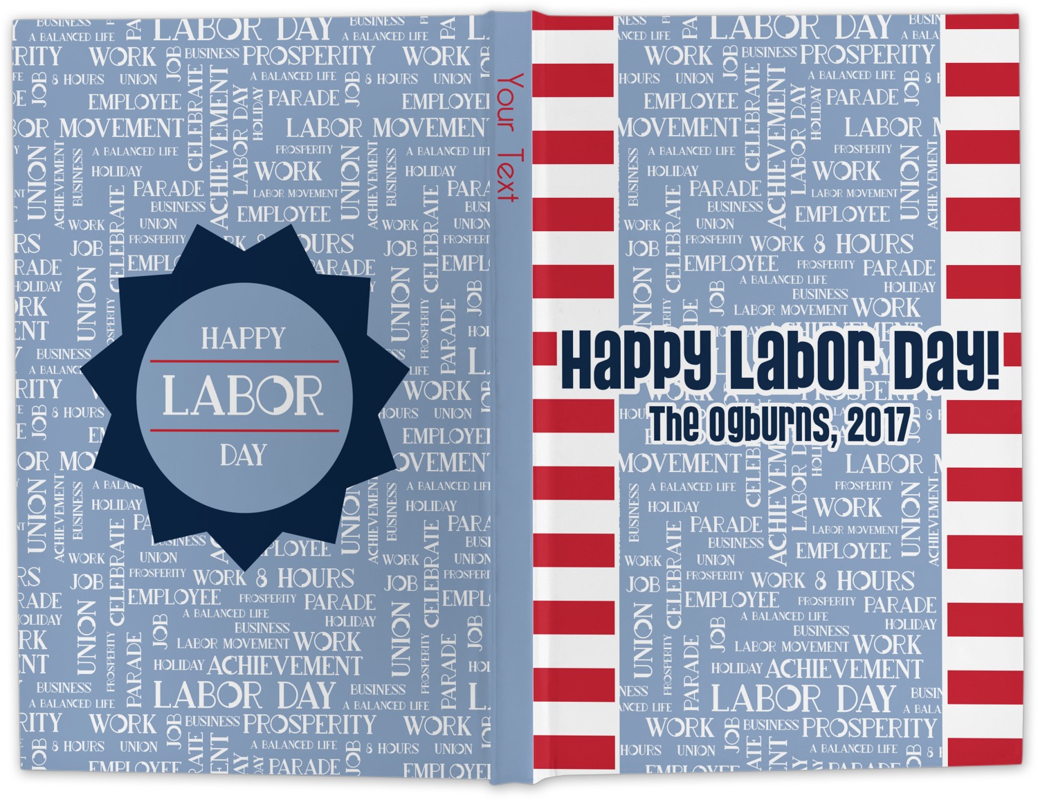 This Labor Design is a fun bright red and a subtle light blue, with white accenting all around. A red and white striped pattern is used, as well as a light blue pattern with a white word cloud on it. The word cloud pattern is a combination of themed words having to do with Labor Day, like "work," "prosperity," and "Labor Day." The red and white striped pattern is used on either side of the word cloud pattern, creating a three-part design.
