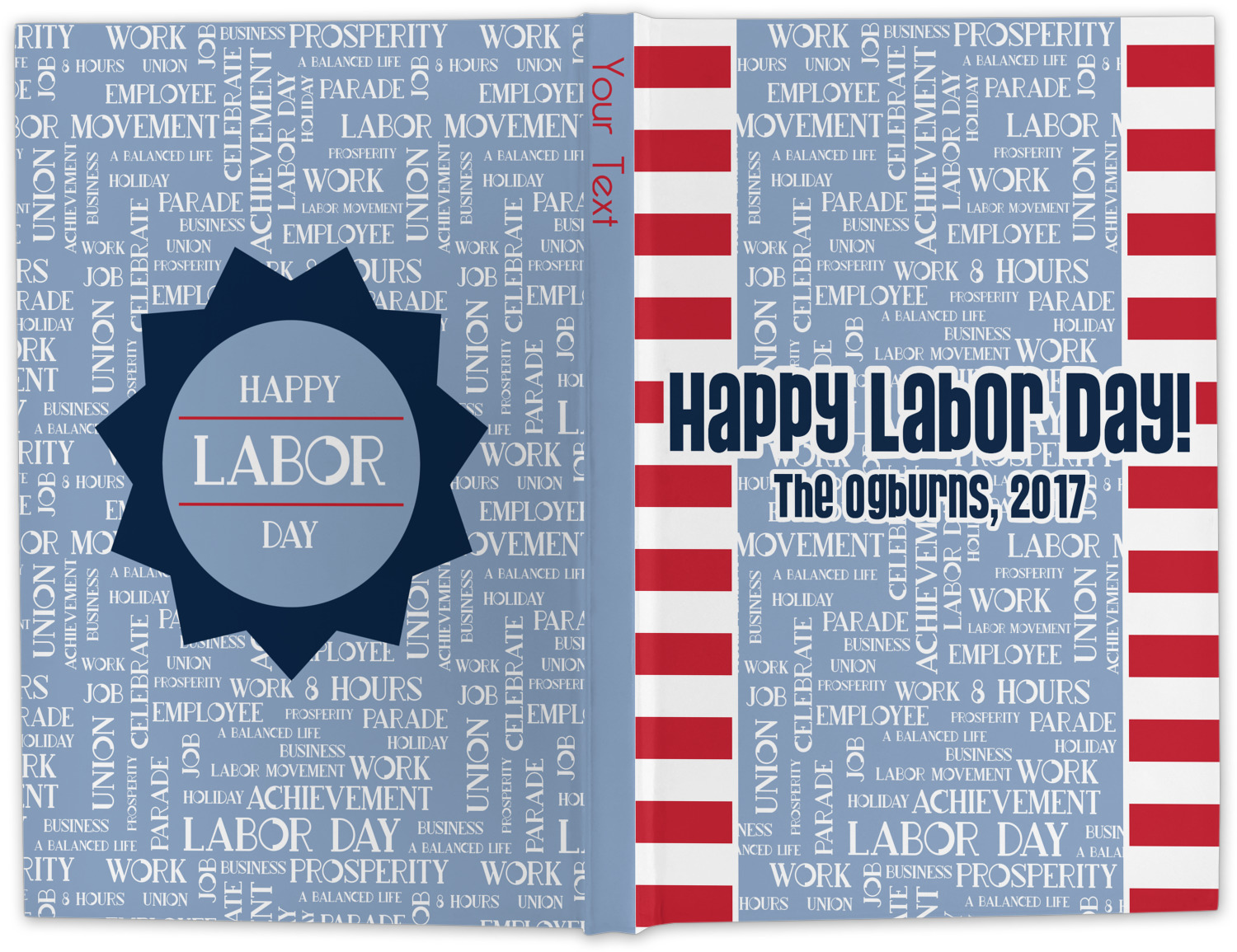 This Labor Design is a fun bright red and a subtle light blue, with white accenting all around. A red and white striped pattern is used, as well as a light blue pattern with a white word cloud on it. The word cloud pattern is a combination of themed words having to do with Labor Day, like "work," "prosperity," and "Labor Day." The red and white striped pattern is used on either side of the word cloud pattern, creating a three-part design.