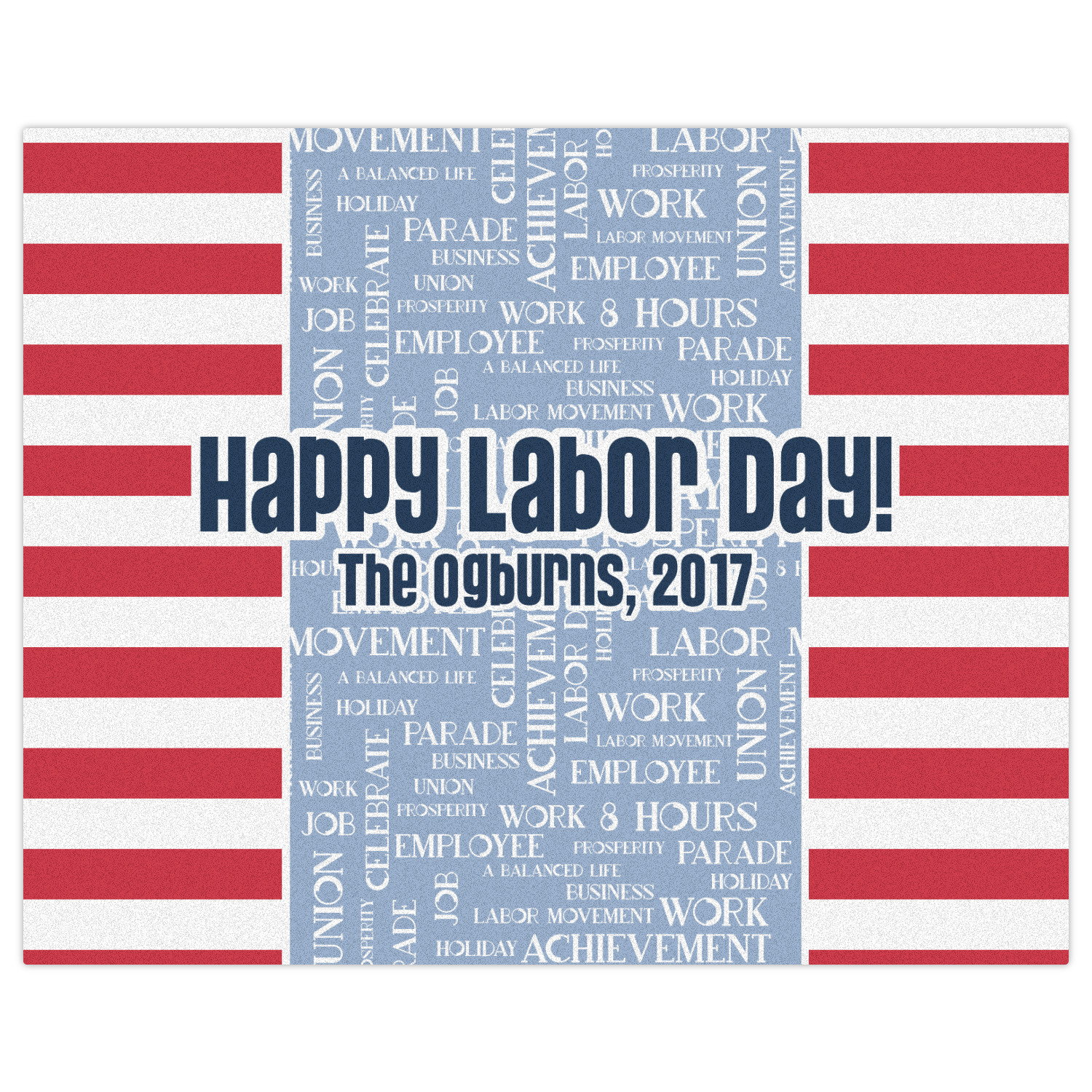 This Labor Design is a fun bright red and a subtle light blue, with white accenting all around. A red and white striped pattern is used, as well as a light blue pattern with a white word cloud on it. The word cloud pattern is a combination of themed words having to do with Labor Day, like "work," "prosperity," and "Labor Day." The red and white striped pattern is used on either side of the word cloud pattern, creating a three-part design.