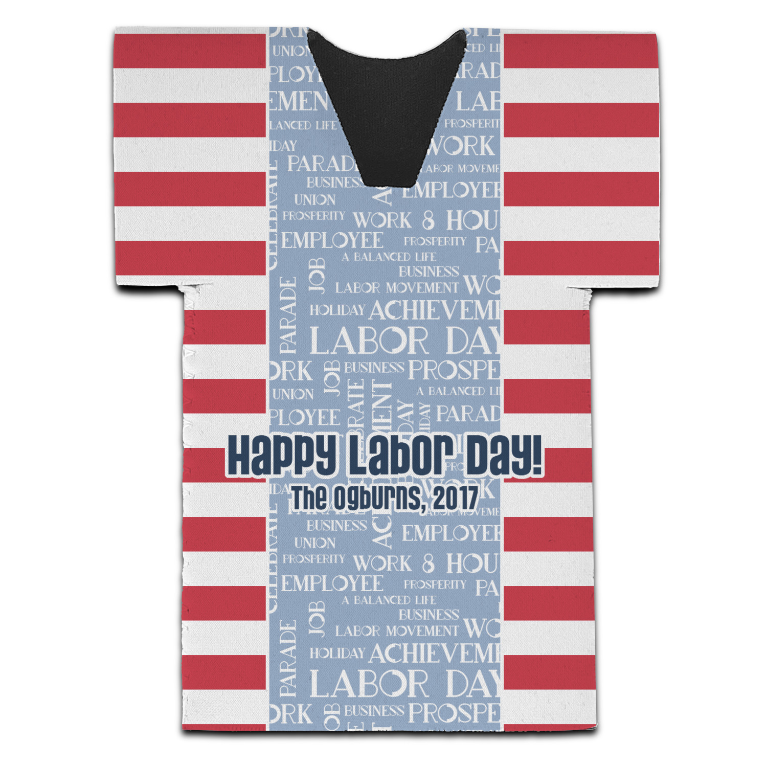 This Labor Design is a fun bright red and a subtle light blue, with white accenting all around. A red and white striped pattern is used, as well as a light blue pattern with a white word cloud on it. The word cloud pattern is a combination of themed words having to do with Labor Day, like "work," "prosperity," and "Labor Day." The red and white striped pattern is used on either side of the word cloud pattern, creating a three-part design.