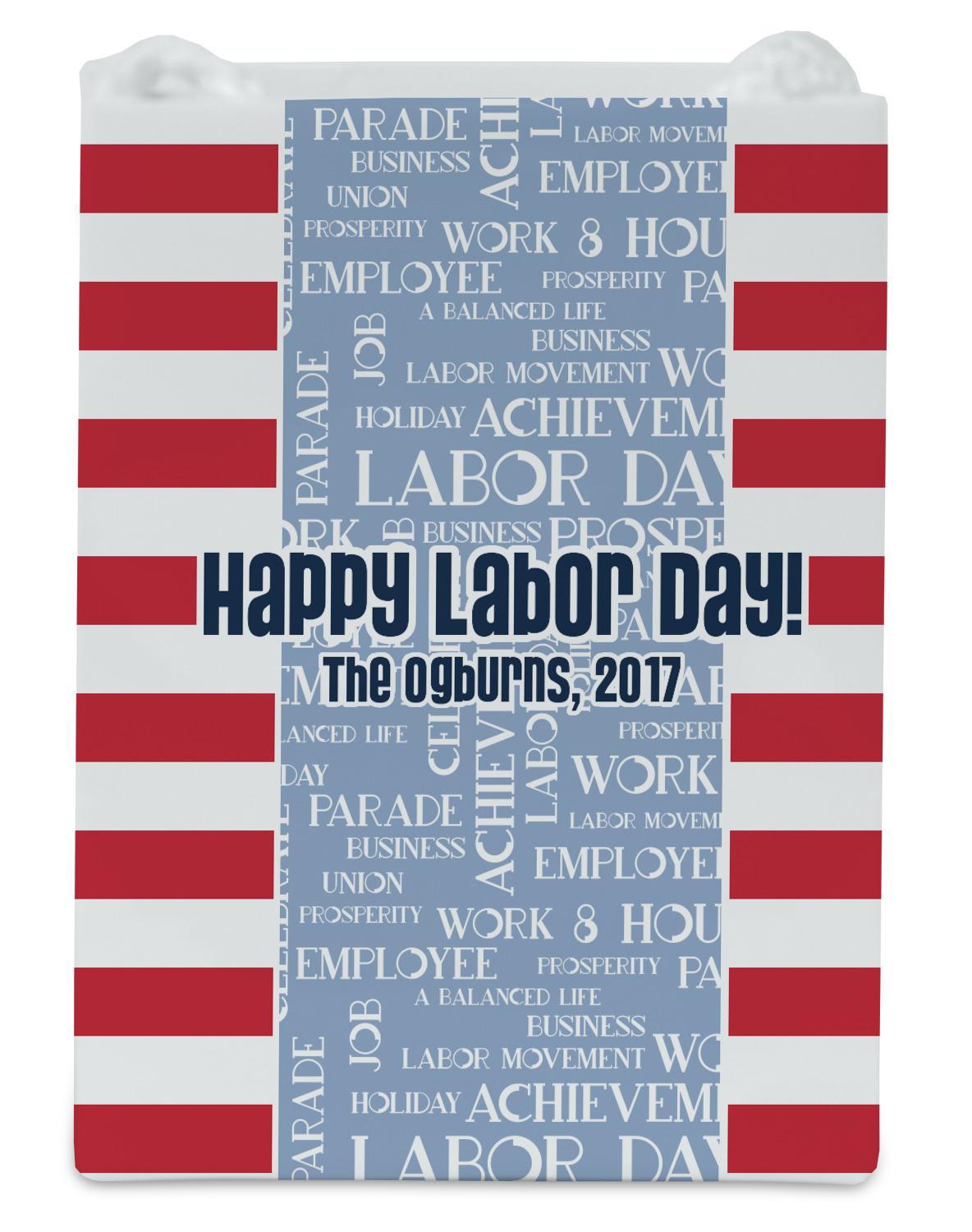 This Labor Design is a fun bright red and a subtle light blue, with white accenting all around. A red and white striped pattern is used, as well as a light blue pattern with a white word cloud on it. The word cloud pattern is a combination of themed words having to do with Labor Day, like "work," "prosperity," and "Labor Day." The red and white striped pattern is used on either side of the word cloud pattern, creating a three-part design.