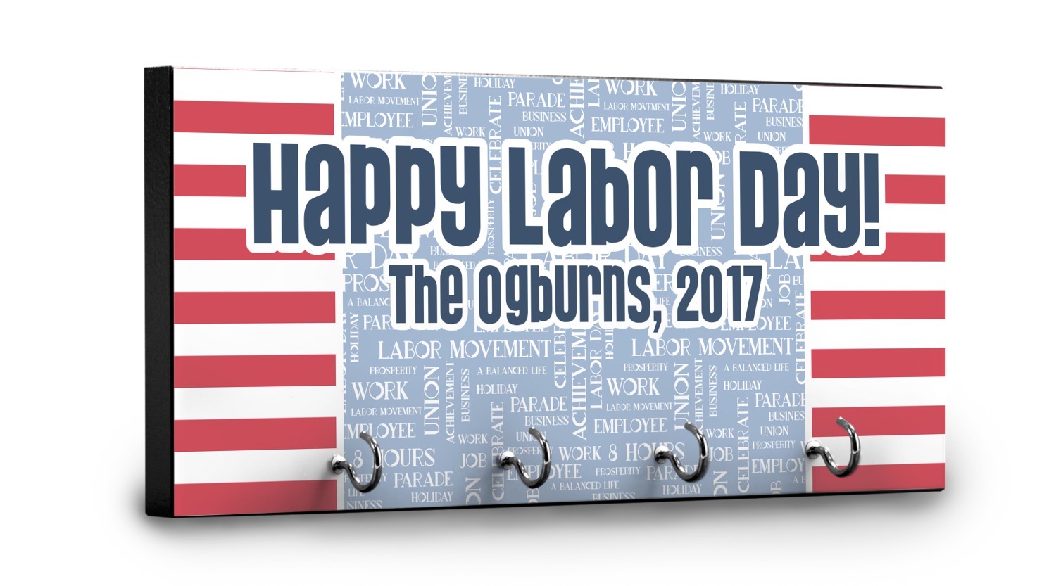 This Labor Design is a fun bright red and a subtle light blue, with white accenting all around. A red and white striped pattern is used, as well as a light blue pattern with a white word cloud on it. The word cloud pattern is a combination of themed words having to do with Labor Day, like "work," "prosperity," and "Labor Day." The red and white striped pattern is used on either side of the word cloud pattern, creating a three-part design.