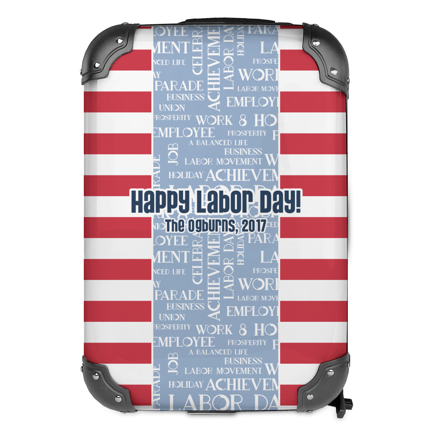 This Labor Design is a fun bright red and a subtle light blue, with white accenting all around. A red and white striped pattern is used, as well as a light blue pattern with a white word cloud on it. The word cloud pattern is a combination of themed words having to do with Labor Day, like "work," "prosperity," and "Labor Day." The red and white striped pattern is used on either side of the word cloud pattern, creating a three-part design.