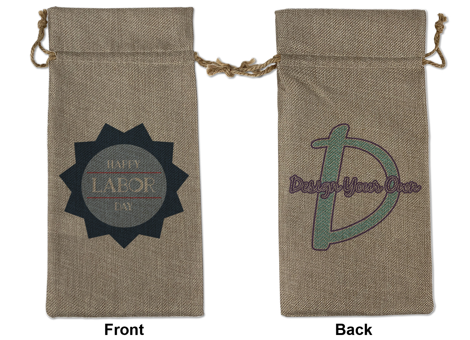 We sell our Burlap Gift Bags in 3 variant sized bags. Made with burlap polyester, each personalized bag can be secured with a twine drawstring pull. Your custom design is available to print on one side or both sides - completely up to you! The sizes of the bags measure approximately 4.5" x 6.5" for the smallest size, 6.5" x 8.0" for the medium size, and 6.5" x 13.5" for the large-sized bag.