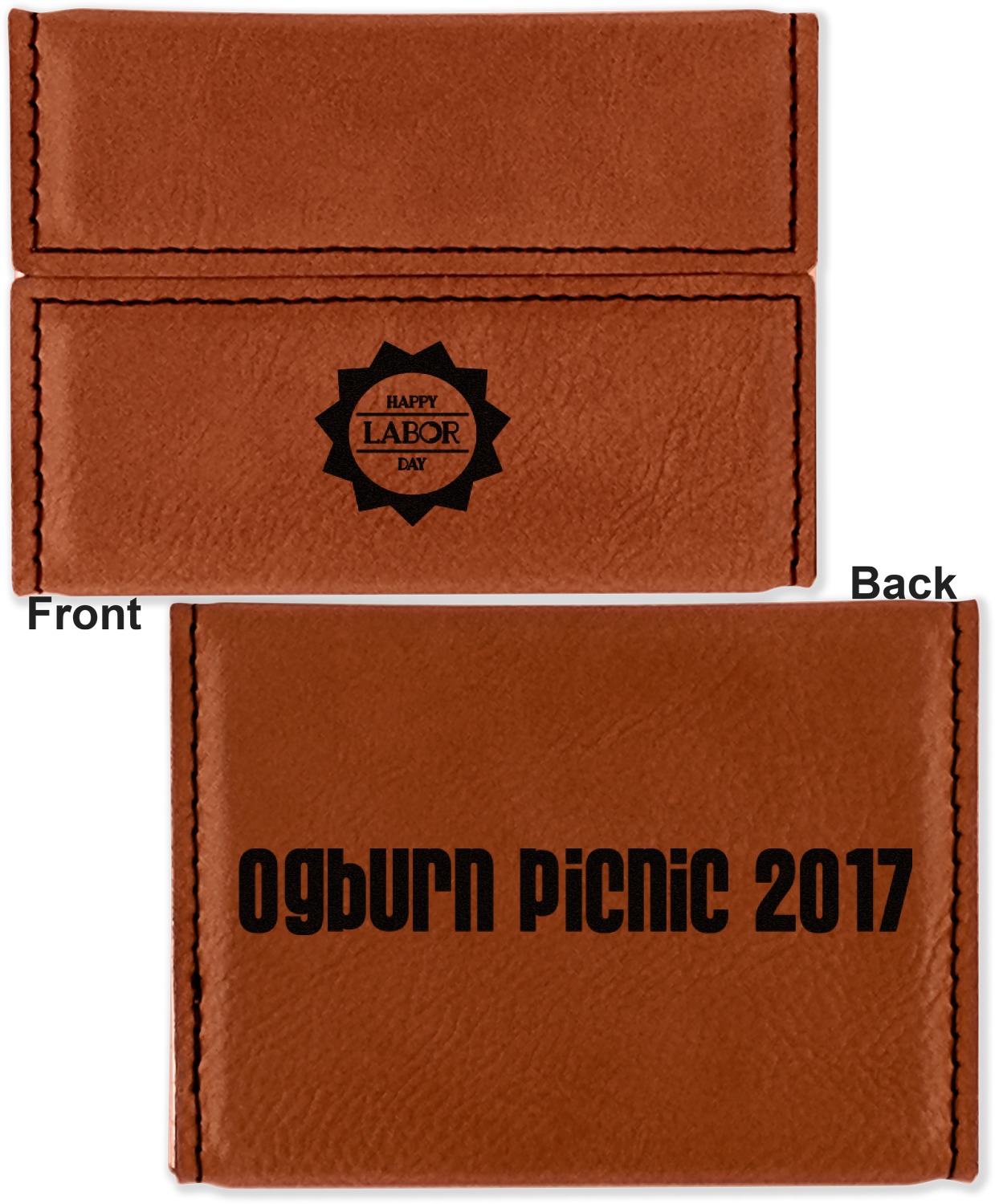 Your personalized design is laser engraved onto either the front, or the front and back of the card holder, depending on the model you purchase. Once engraved, the design will appear a darkened black against the cognac color of the leatherette.