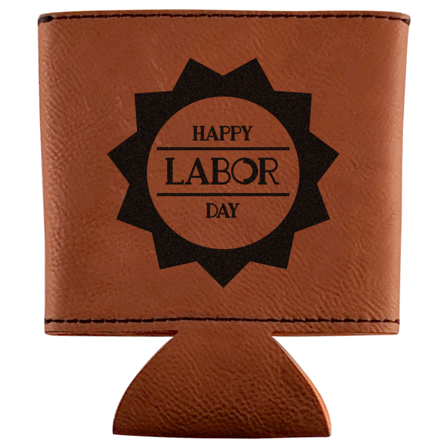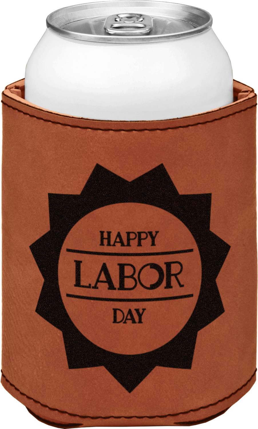 This can sleeve is made from a cognac-brown leatherette and stitched with a sturdy, black thread. A slim padding lines the inside of your can sleeve to allow for a better fit once your drink is inserted. The sleeve itself measures at 4 by 4.5 inches, allowing this custom can sleeve to accommodate most canned drinks. Your personalized design can be engraved on the front and back, or solely the front. When laser-engraved, your design appears as a black coloration which contrasts the leatherette nicely.