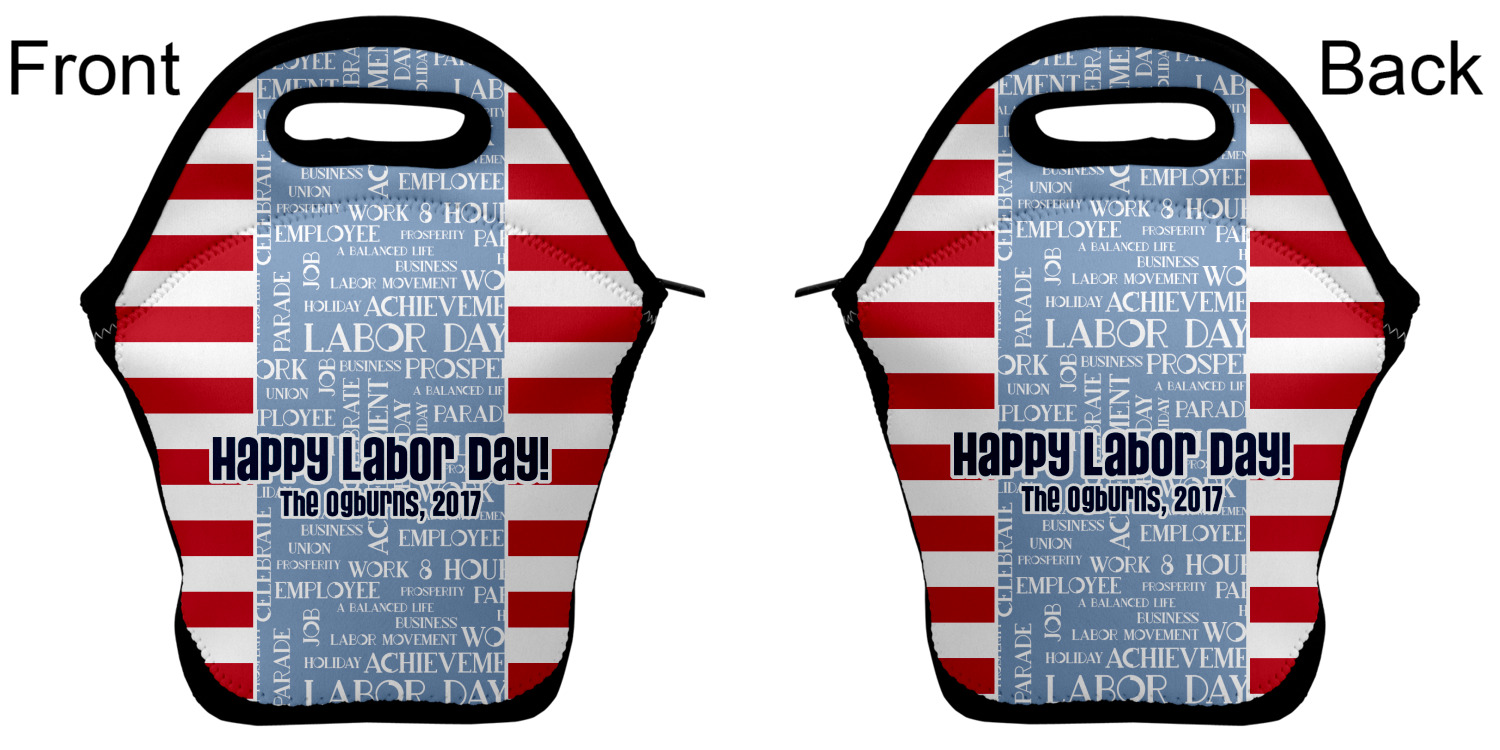 Our personalized lunch bags are made from a strong neoprene, and secure with a zipper closure that lines the top of the bag.The edges of the neoprene are sewn together with a heavy duty stitch, adding to the durability of the bag. The is accompanied by a reinforced handle at its top, for the easy transport of your lunch. We display your personalization across both the front and back of this neoprene lunch bag, while the remaining sides are a sleek black in color. Each bag measures at 13.5 inches tall, and 11.5 inches wide.