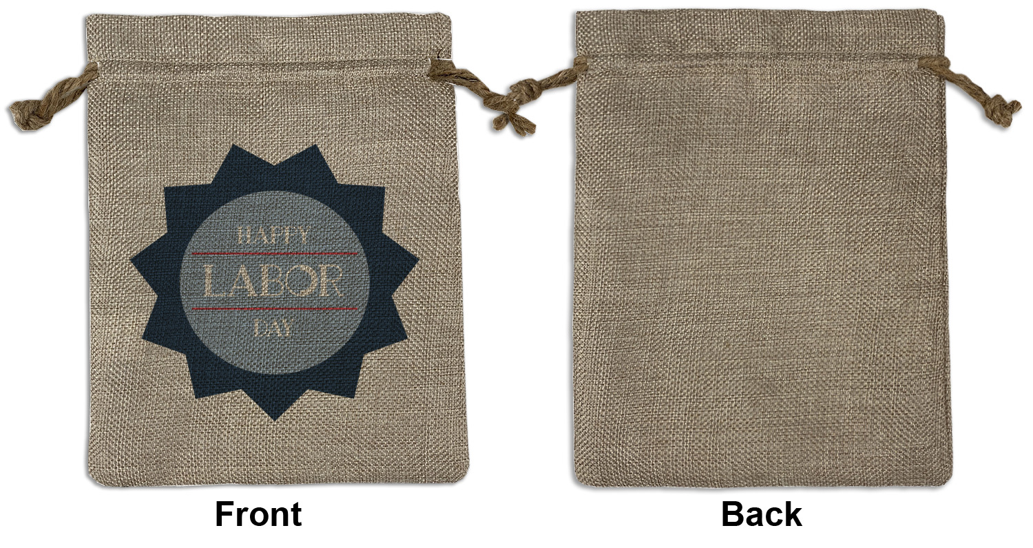 We sell our Burlap Gift Bags in 3 variant sized bags. Made with burlap polyester, each personalized bag can be secured with a twine drawstring pull. Your custom design is available to print on one side or both sides - completely up to you! The sizes of the bags measure approximately 4.5" x 6.5" for the smallest size, 6.5" x 8.0" for the medium size, and 6.5" x 13.5" for the large-sized bag.