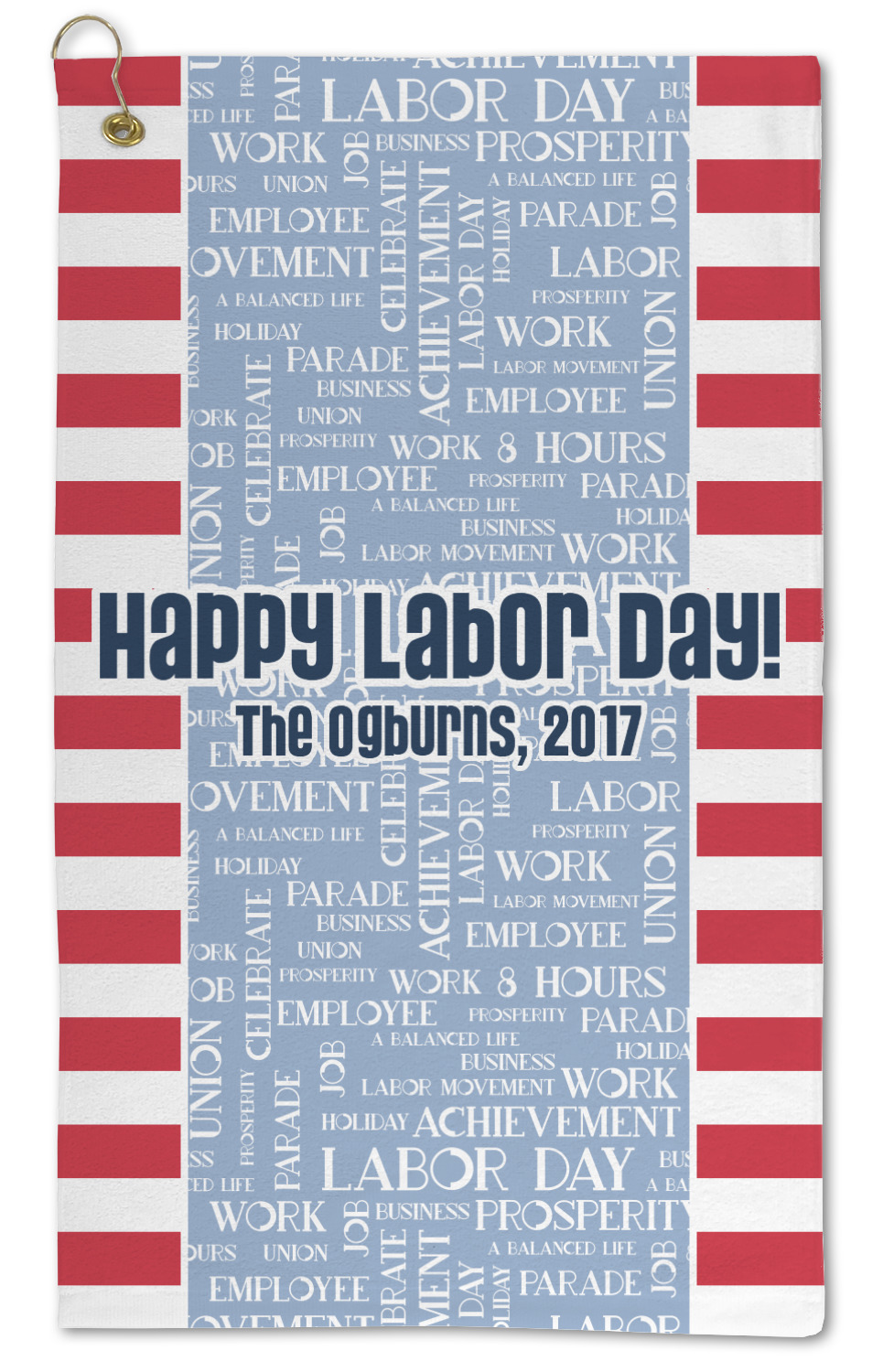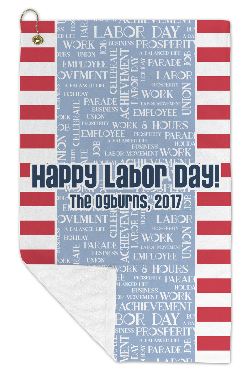 This Labor Design is a fun bright red and a subtle light blue, with white accenting all around. A red and white striped pattern is used, as well as a light blue pattern with a white word cloud on it. The word cloud pattern is a combination of themed words having to do with Labor Day, like "work," "prosperity," and "Labor Day." The red and white striped pattern is used on either side of the word cloud pattern, creating a three-part design.