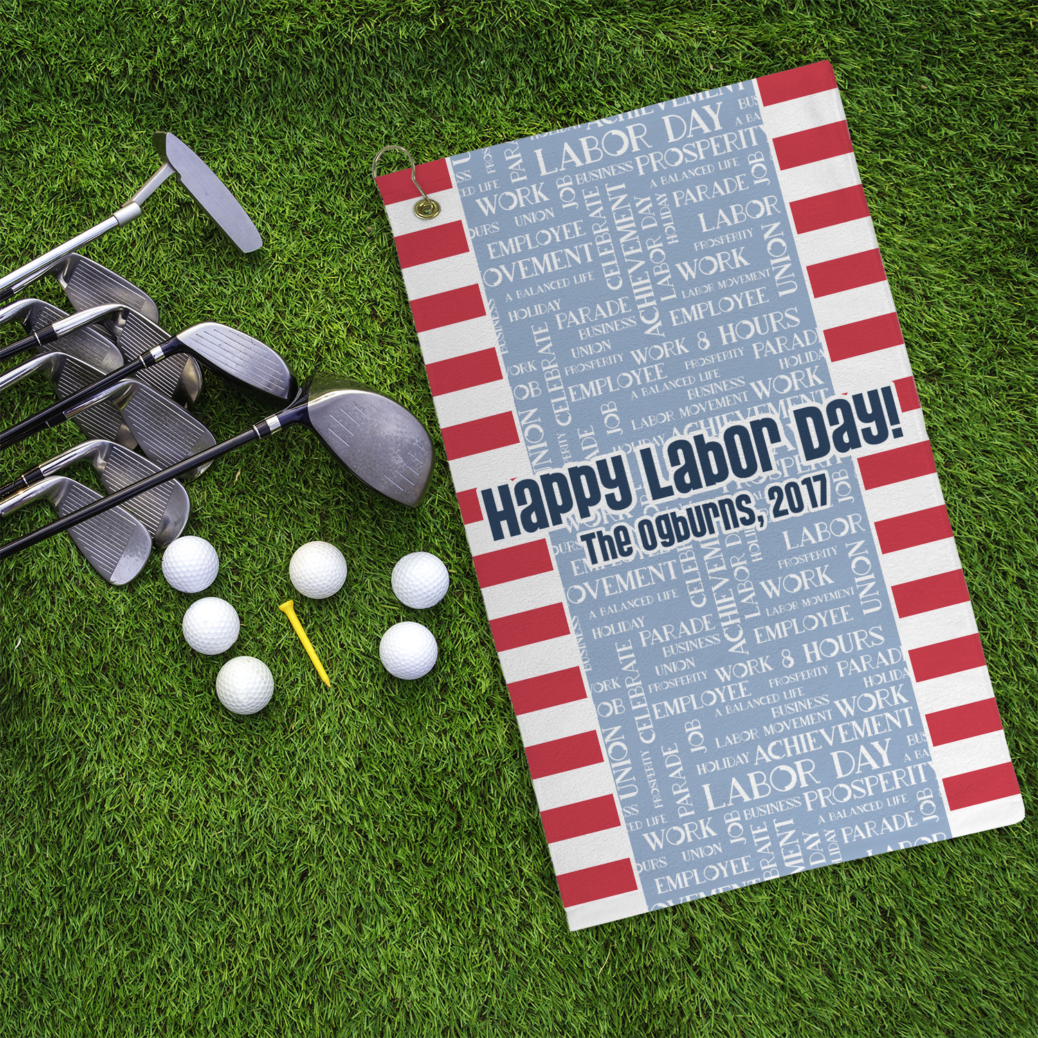 A fun red, white, and blue Labor Day badge is used in the coordinating part of the design. There are two different kinds of fonts used. One in the word cloud and one used in the personalization.
