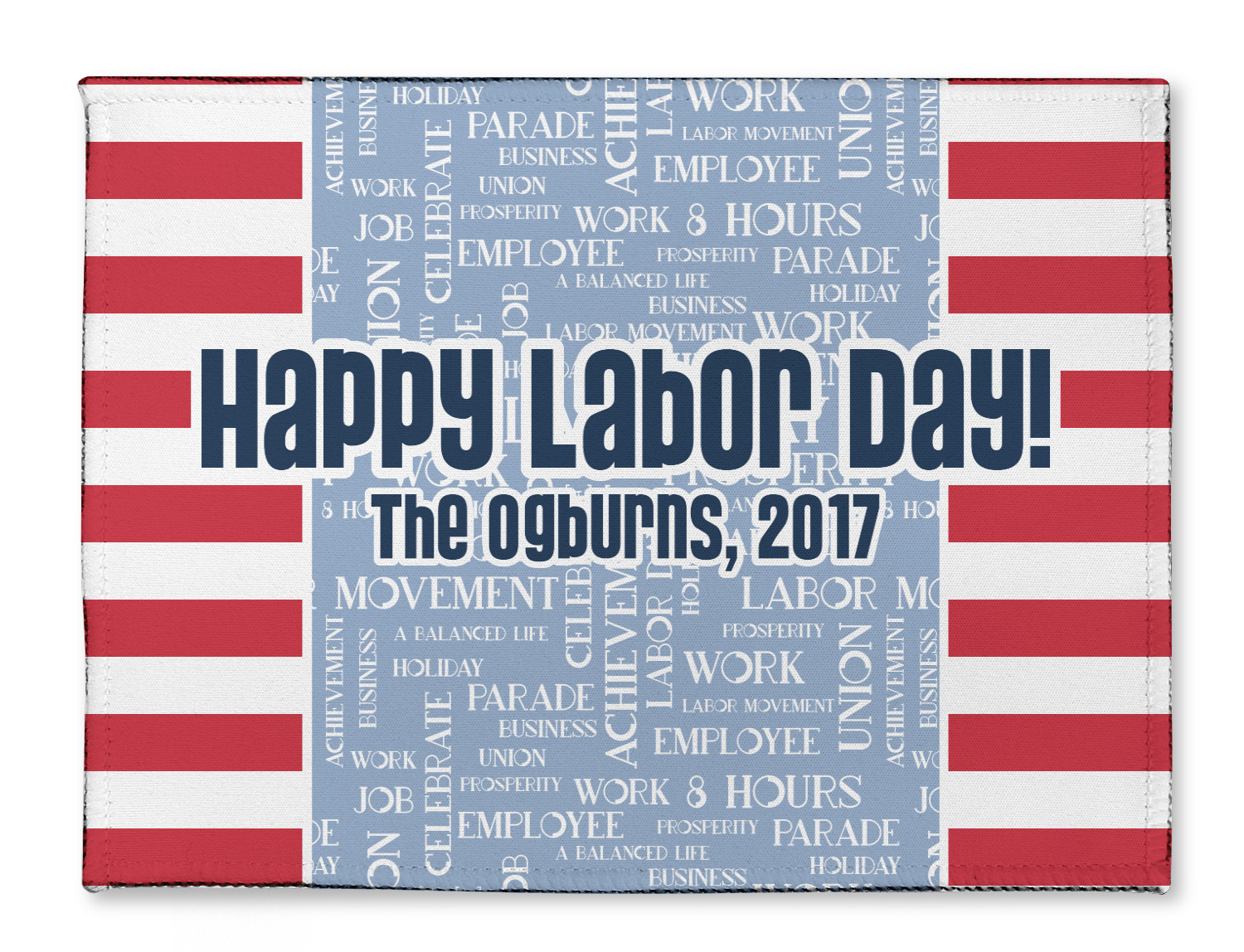 This Labor Design is a fun bright red and a subtle light blue, with white accenting all around. A red and white striped pattern is used, as well as a light blue pattern with a white word cloud on it. The word cloud pattern is a combination of themed words having to do with Labor Day, like "work," "prosperity," and "Labor Day." The red and white striped pattern is used on either side of the word cloud pattern, creating a three-part design.