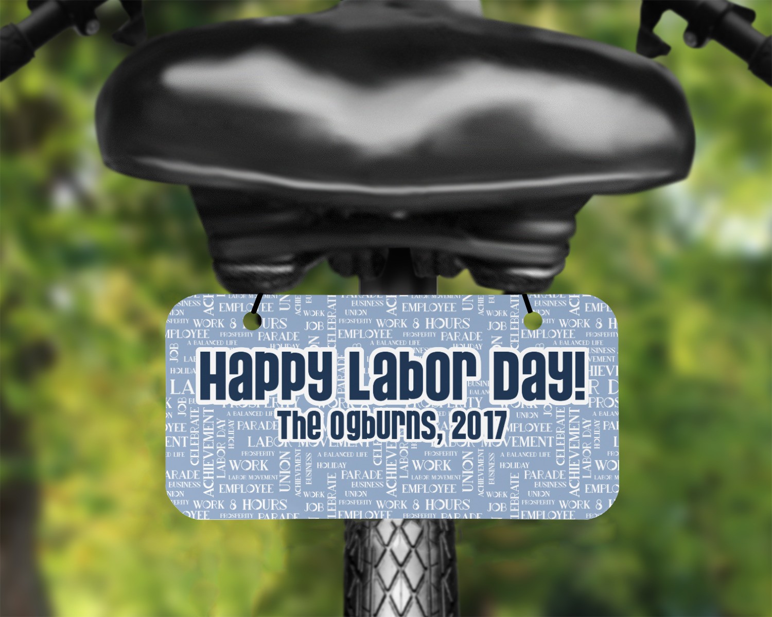 This Labor Design is a fun bright red and a subtle light blue, with white accenting all around. A red and white striped pattern is used, as well as a light blue pattern with a white word cloud on it. The word cloud pattern is a combination of themed words having to do with Labor Day, like "work," "prosperity," and "Labor Day." The red and white striped pattern is used on either side of the word cloud pattern, creating a three-part design.