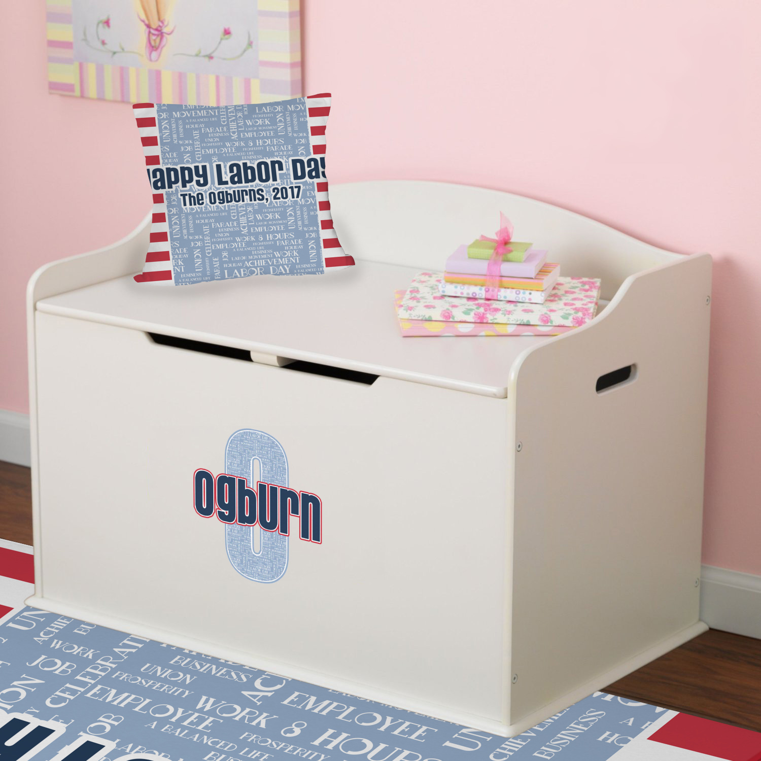 A fun red, white, and blue Labor Day badge is used in the coordinating part of the design. There are two different kinds of fonts used. One in the word cloud and one used in the personalization.