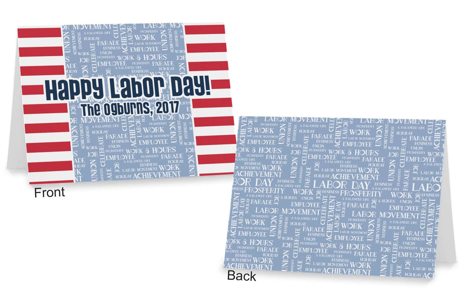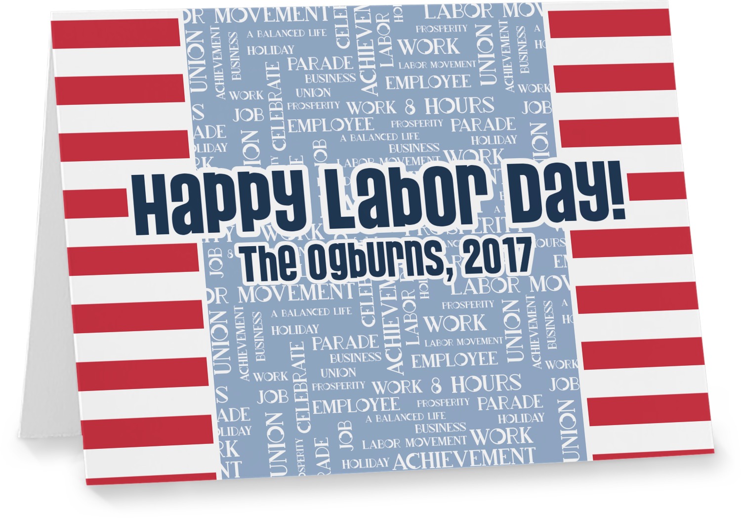 This Labor Design is a fun bright red and a subtle light blue, with white accenting all around. A red and white striped pattern is used, as well as a light blue pattern with a white word cloud on it. The word cloud pattern is a combination of themed words having to do with Labor Day, like "work," "prosperity," and "Labor Day." The red and white striped pattern is used on either side of the word cloud pattern, creating a three-part design.
