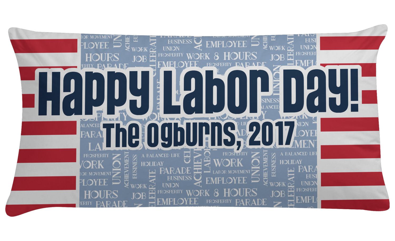 This Labor Design is a fun bright red and a subtle light blue, with white accenting all around. A red and white striped pattern is used, as well as a light blue pattern with a white word cloud on it. The word cloud pattern is a combination of themed words having to do with Labor Day, like "work," "prosperity," and "Labor Day." The red and white striped pattern is used on either side of the word cloud pattern, creating a three-part design.