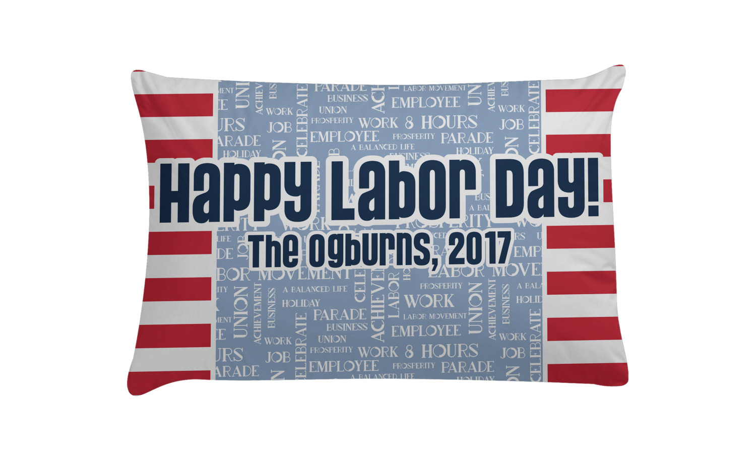 This Labor Design is a fun bright red and a subtle light blue, with white accenting all around. A red and white striped pattern is used, as well as a light blue pattern with a white word cloud on it. The word cloud pattern is a combination of themed words having to do with Labor Day, like "work," "prosperity," and "Labor Day." The red and white striped pattern is used on either side of the word cloud pattern, creating a three-part design.