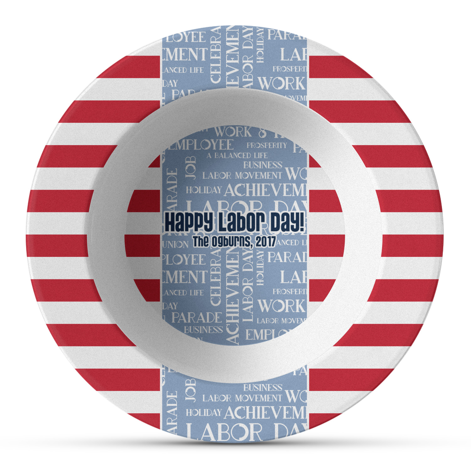 A fun red, white, and blue Labor Day badge is used in the coordinating part of the design. There are two different kinds of fonts used. One in the word cloud and one used in the personalization.