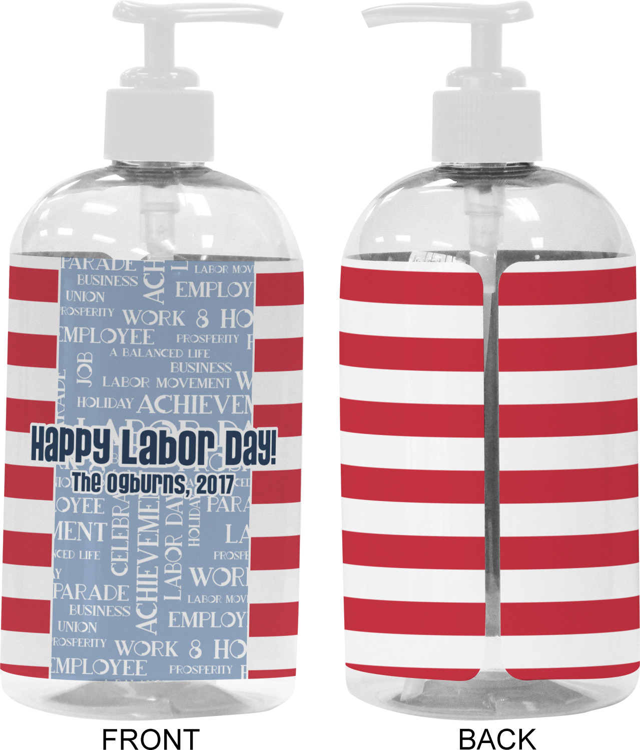 A fun red, white, and blue Labor Day badge is used in the coordinating part of the design. There are two different kinds of fonts used. One in the word cloud and one used in the personalization.