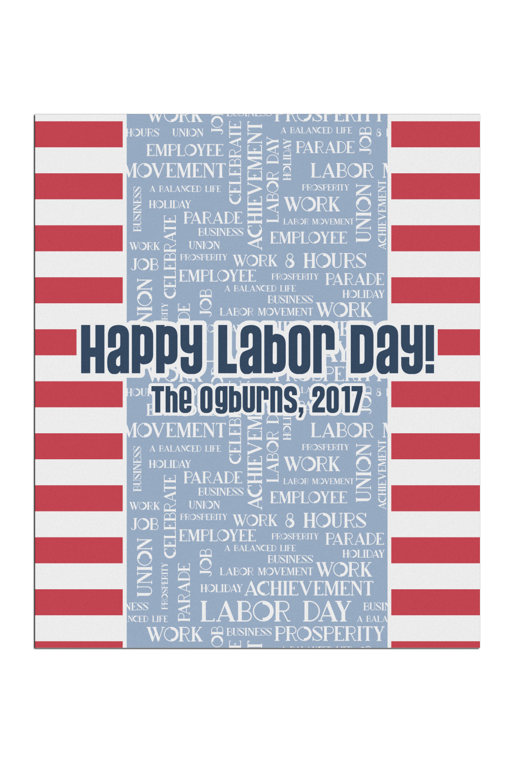 This Labor Design is a fun bright red and a subtle light blue, with white accenting all around. A red and white striped pattern is used, as well as a light blue pattern with a white word cloud on it. The word cloud pattern is a combination of themed words having to do with Labor Day, like "work," "prosperity," and "Labor Day." The red and white striped pattern is used on either side of the word cloud pattern, creating a three-part design.
