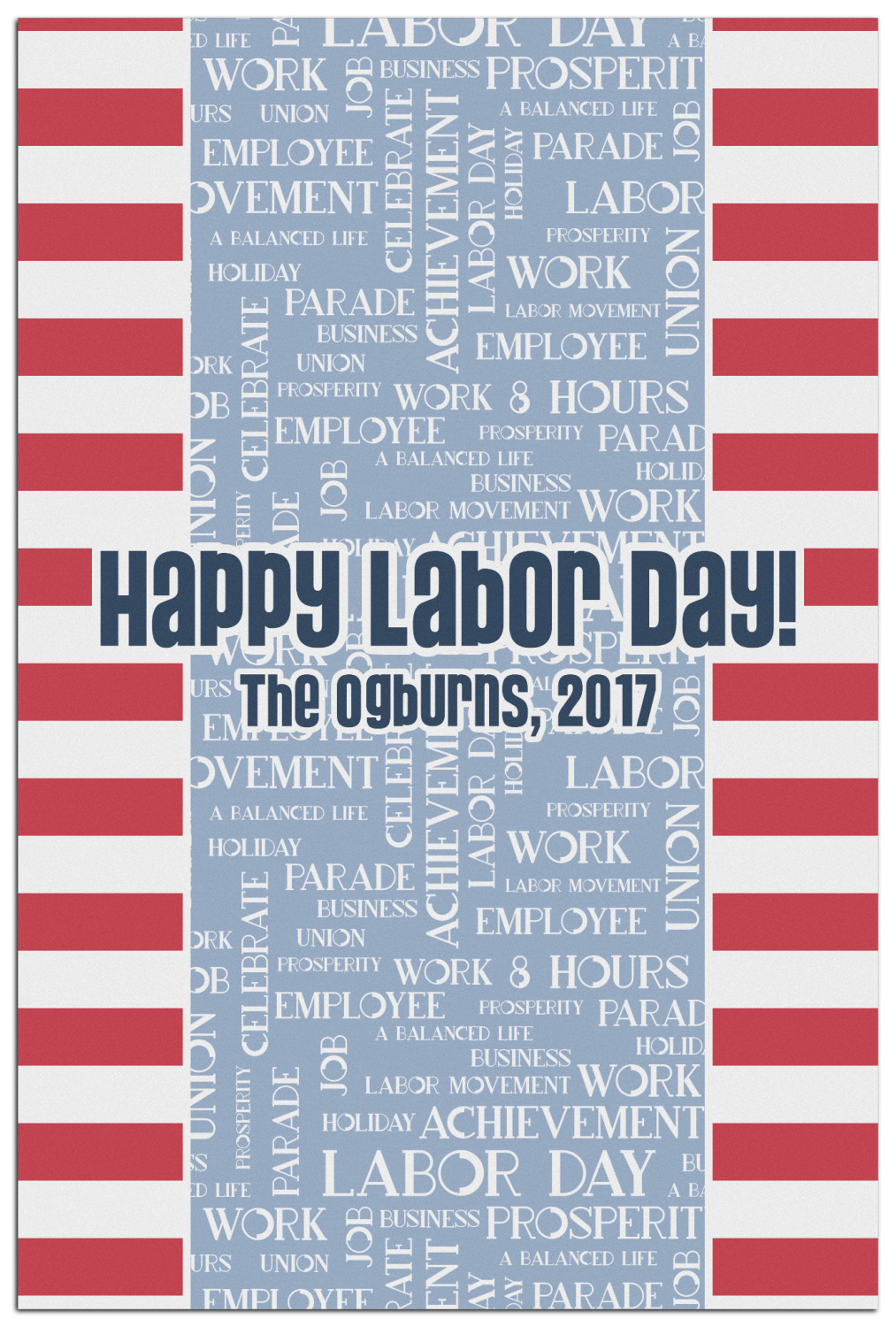 This Labor Design is a fun bright red and a subtle light blue, with white accenting all around. A red and white striped pattern is used, as well as a light blue pattern with a white word cloud on it. The word cloud pattern is a combination of themed words having to do with Labor Day, like "work," "prosperity," and "Labor Day." The red and white striped pattern is used on either side of the word cloud pattern, creating a three-part design.