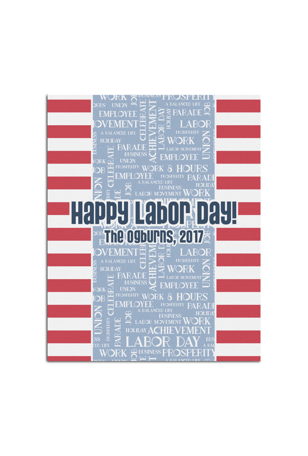 This Labor Design is a fun bright red and a subtle light blue, with white accenting all around. A red and white striped pattern is used, as well as a light blue pattern with a white word cloud on it. The word cloud pattern is a combination of themed words having to do with Labor Day, like "work," "prosperity," and "Labor Day." The red and white striped pattern is used on either side of the word cloud pattern, creating a three-part design.