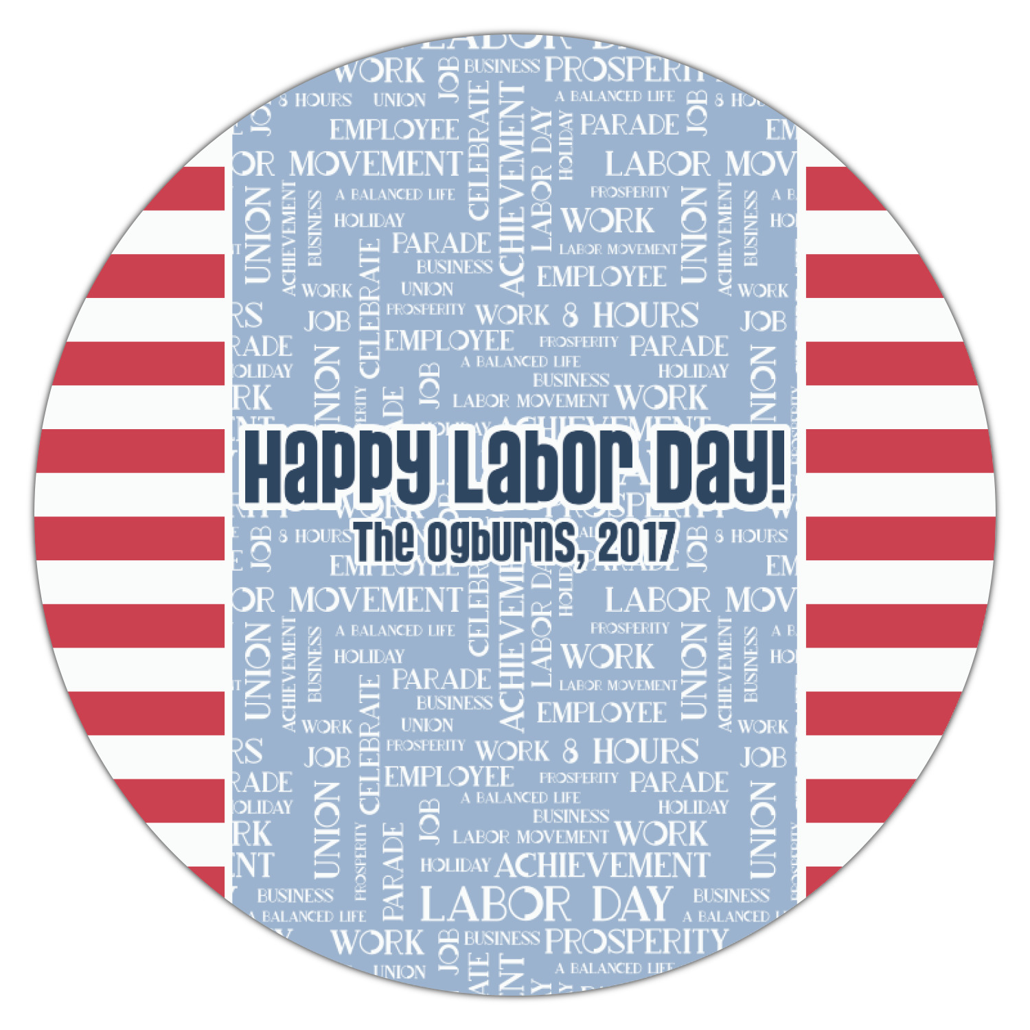 A fun red, white, and blue Labor Day badge is used in the coordinating part of the design. There are two different kinds of fonts used. One in the word cloud and one used in the personalization.