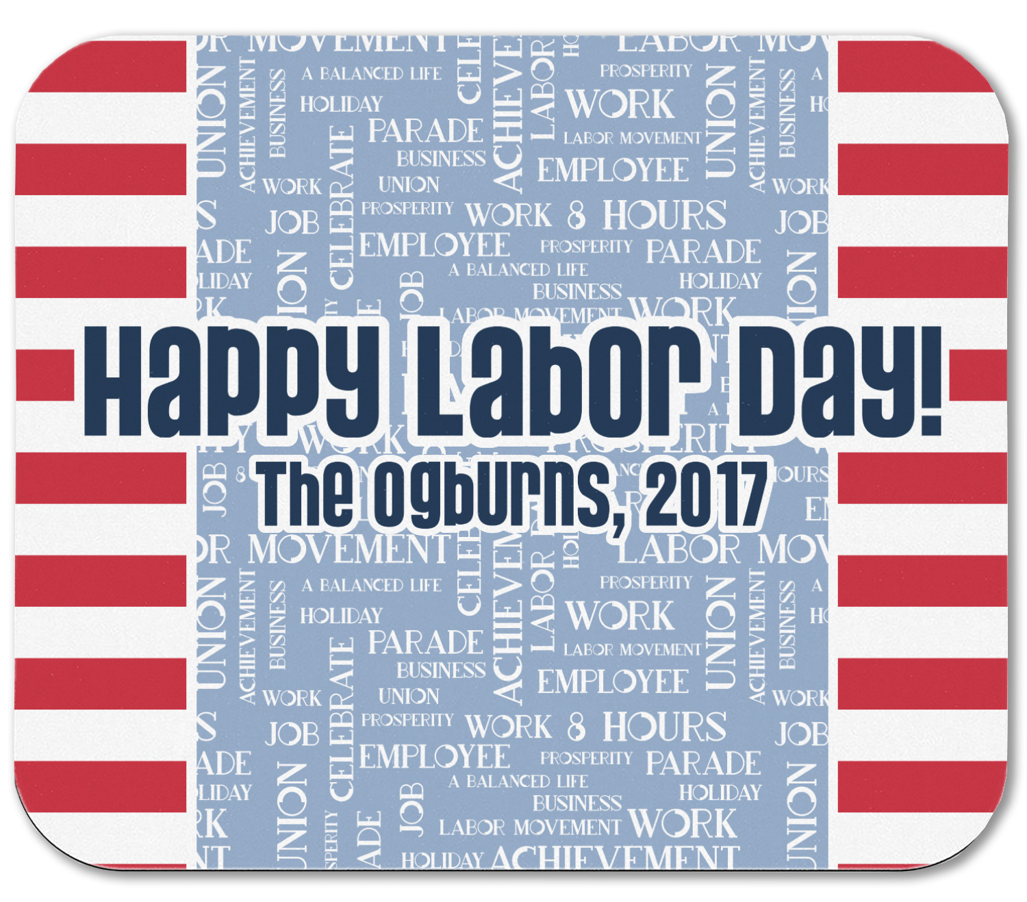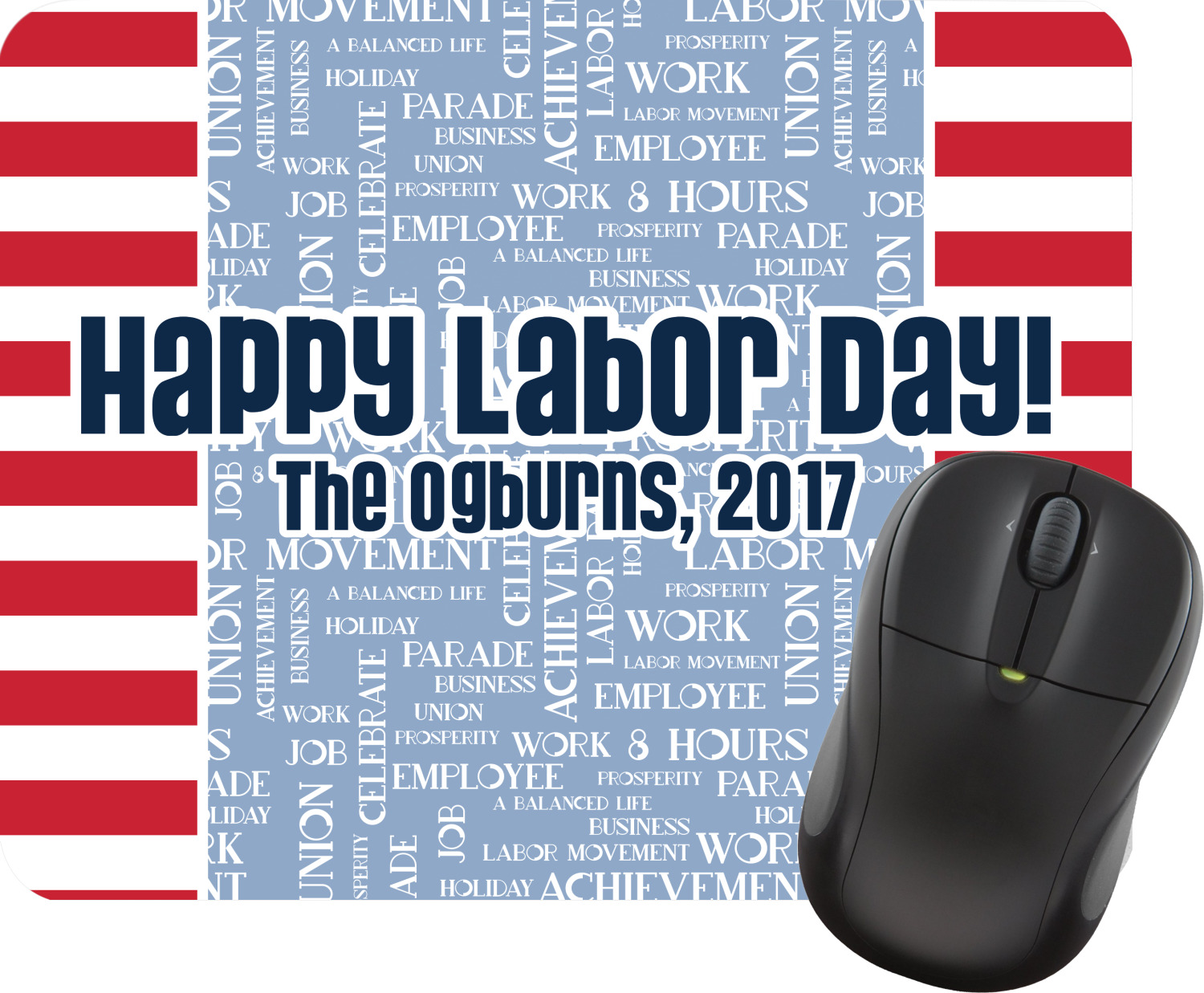 A fun red, white, and blue Labor Day badge is used in the coordinating part of the design. There are two different kinds of fonts used. One in the word cloud and one used in the personalization.