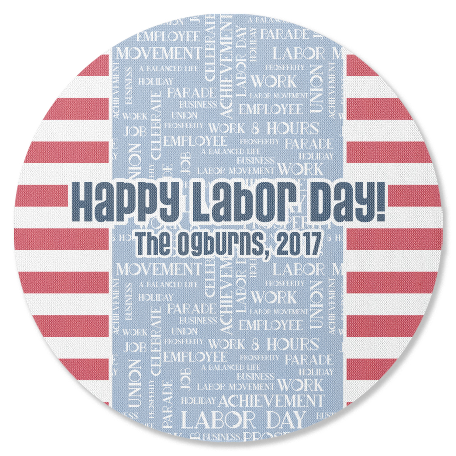 A fun red, white, and blue Labor Day badge is used in the coordinating part of the design. There are two different kinds of fonts used. One in the word cloud and one used in the personalization.