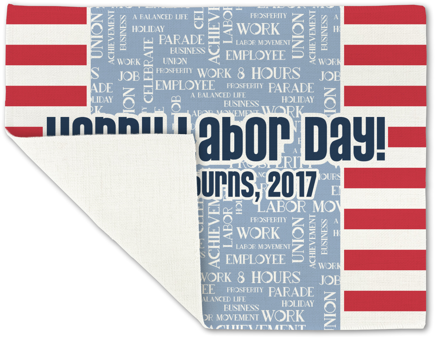 This Labor Design is a fun bright red and a subtle light blue, with white accenting all around. A red and white striped pattern is used, as well as a light blue pattern with a white word cloud on it. The word cloud pattern is a combination of themed words having to do with Labor Day, like "work," "prosperity," and "Labor Day." The red and white striped pattern is used on either side of the word cloud pattern, creating a three-part design.