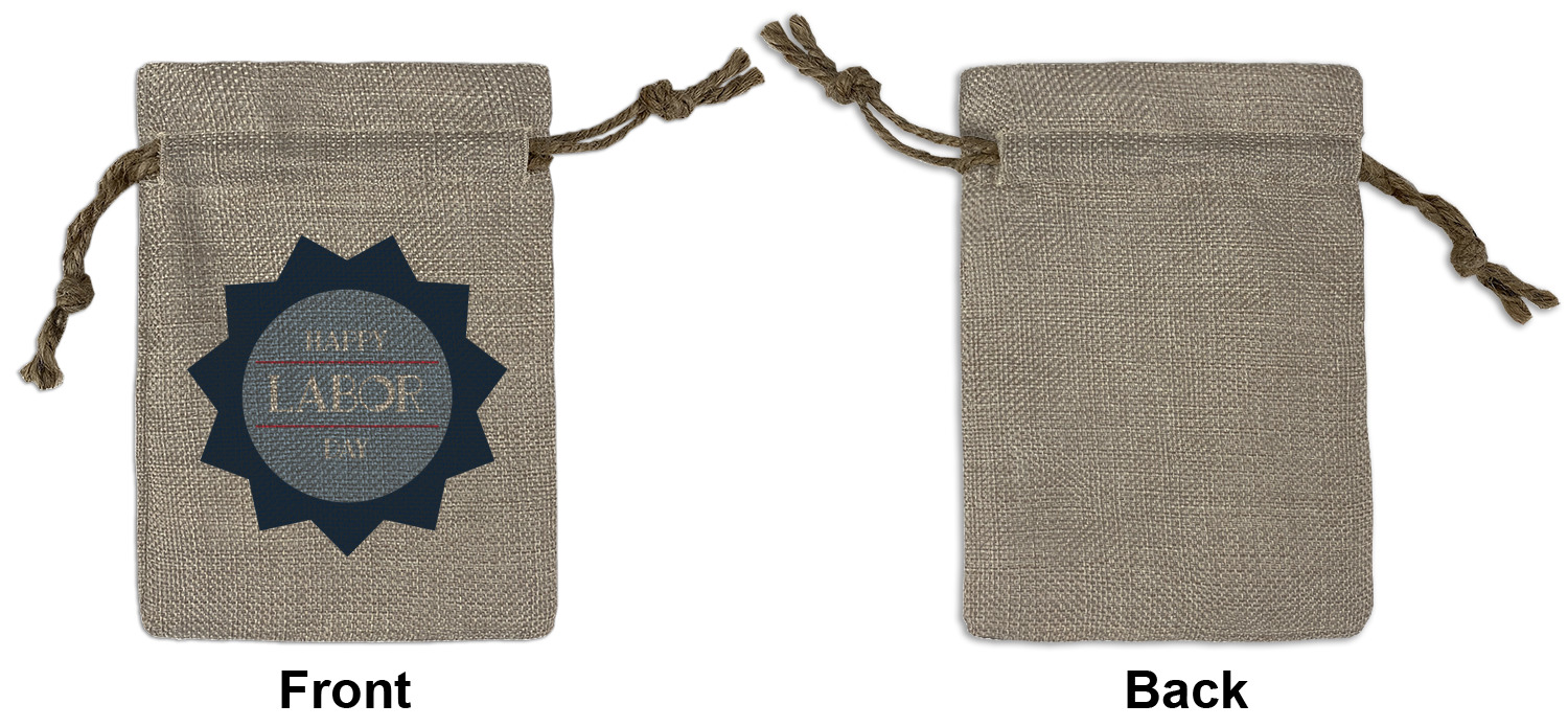 We sell our Burlap Gift Bags in 3 variant sized bags. Made with burlap polyester, each personalized bag can be secured with a twine drawstring pull. Your custom design is available to print on one side or both sides - completely up to you! The sizes of the bags measure approximately 4.5" x 6.5" for the smallest size, 6.5" x 8.0" for the medium size, and 6.5" x 13.5" for the large-sized bag.