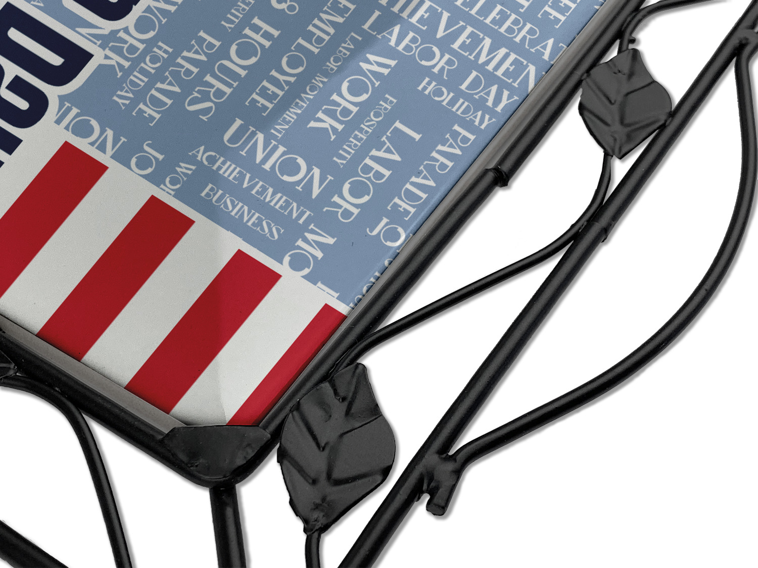 A fun red, white, and blue Labor Day badge is used in the coordinating part of the design. There are two different kinds of fonts used. One in the word cloud and one used in the personalization.
