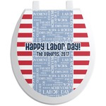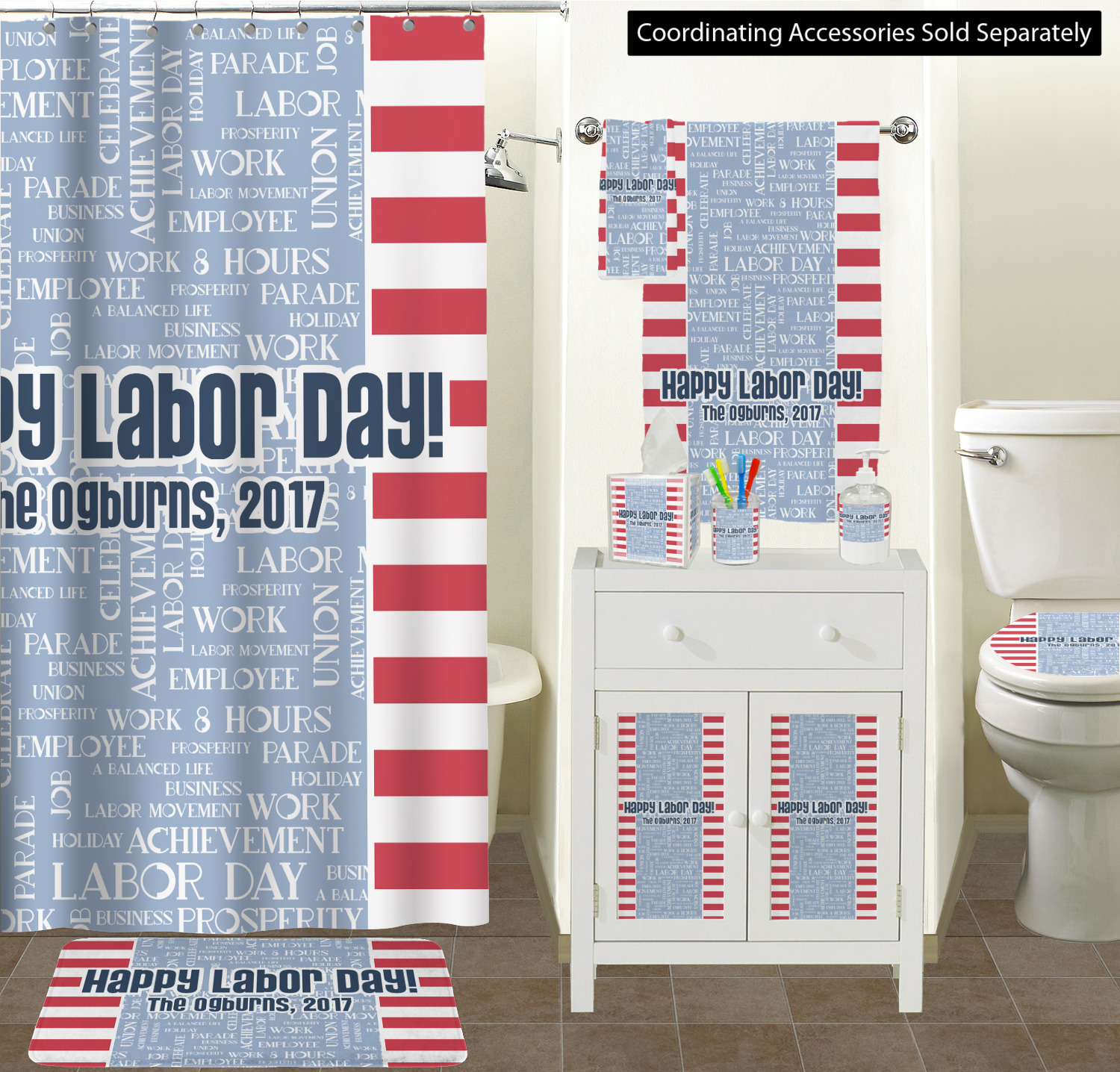 A fun red, white, and blue Labor Day badge is used in the coordinating part of the design. There are two different kinds of fonts used. One in the word cloud and one used in the personalization.