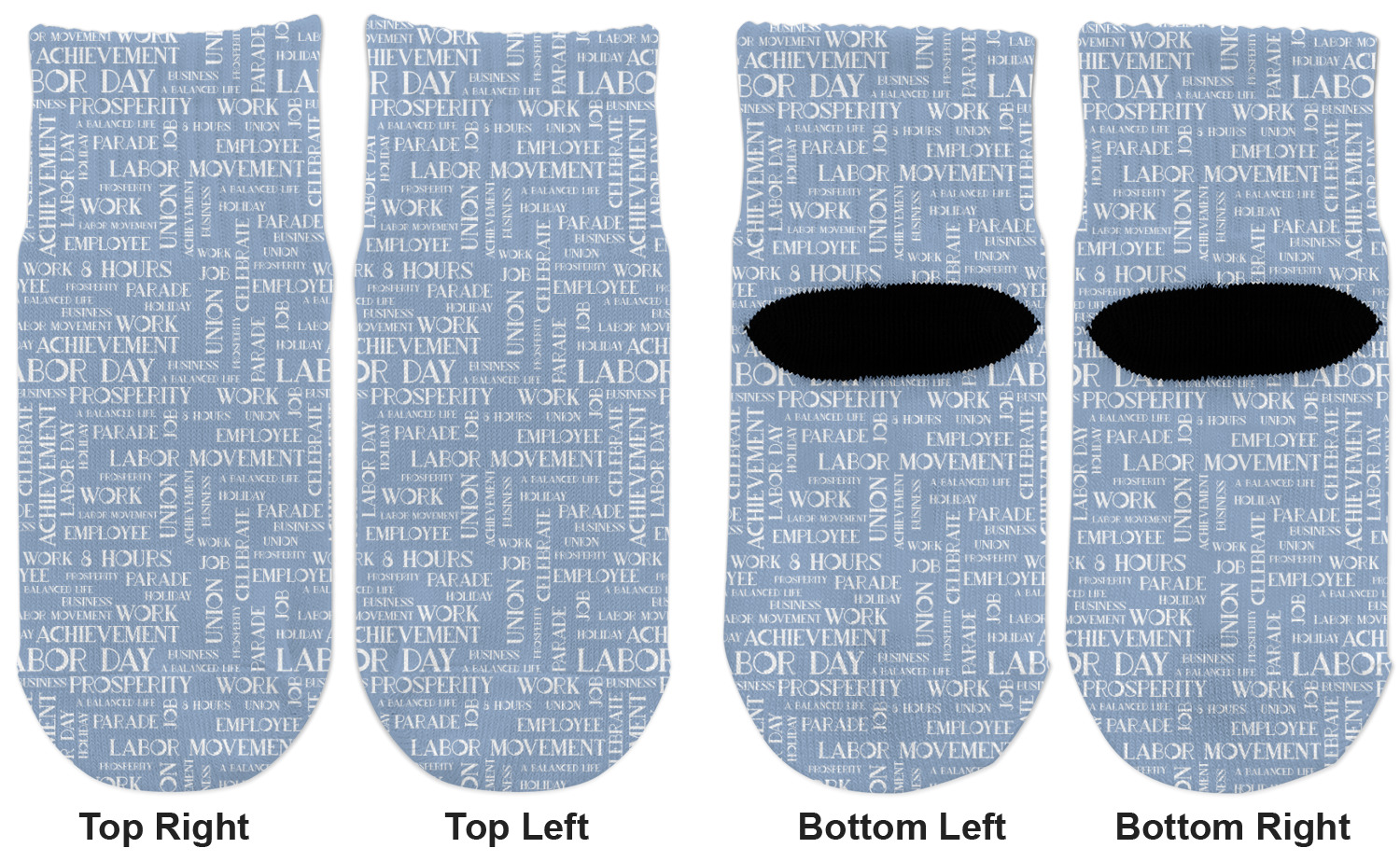 This Labor Design is a fun bright red and a subtle light blue, with white accenting all around. A red and white striped pattern is used, as well as a light blue pattern with a white word cloud on it. The word cloud pattern is a combination of themed words having to do with Labor Day, like "work," "prosperity," and "Labor Day." The red and white striped pattern is used on either side of the word cloud pattern, creating a three-part design.
