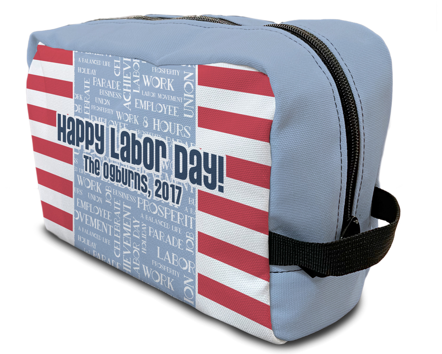 A fun red, white, and blue Labor Day badge is used in the coordinating part of the design. There are two different kinds of fonts used. One in the word cloud and one used in the personalization.