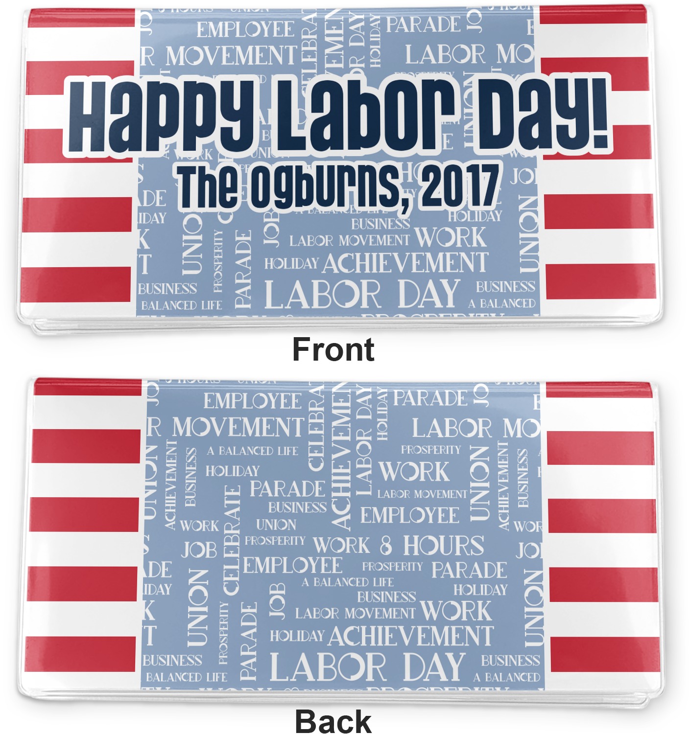A fun red, white, and blue Labor Day badge is used in the coordinating part of the design. There are two different kinds of fonts used. One in the word cloud and one used in the personalization.