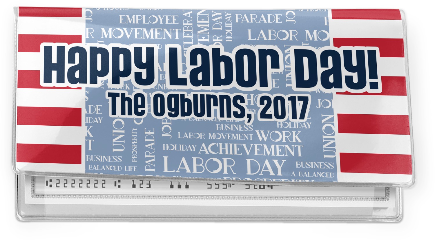 This Labor Design is a fun bright red and a subtle light blue, with white accenting all around. A red and white striped pattern is used, as well as a light blue pattern with a white word cloud on it. The word cloud pattern is a combination of themed words having to do with Labor Day, like "work," "prosperity," and "Labor Day." The red and white striped pattern is used on either side of the word cloud pattern, creating a three-part design.
