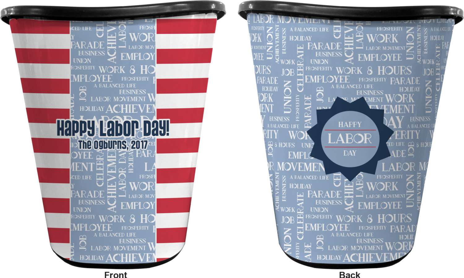 A fun red, white, and blue Labor Day badge is used in the coordinating part of the design. There are two different kinds of fonts used. One in the word cloud and one used in the personalization.