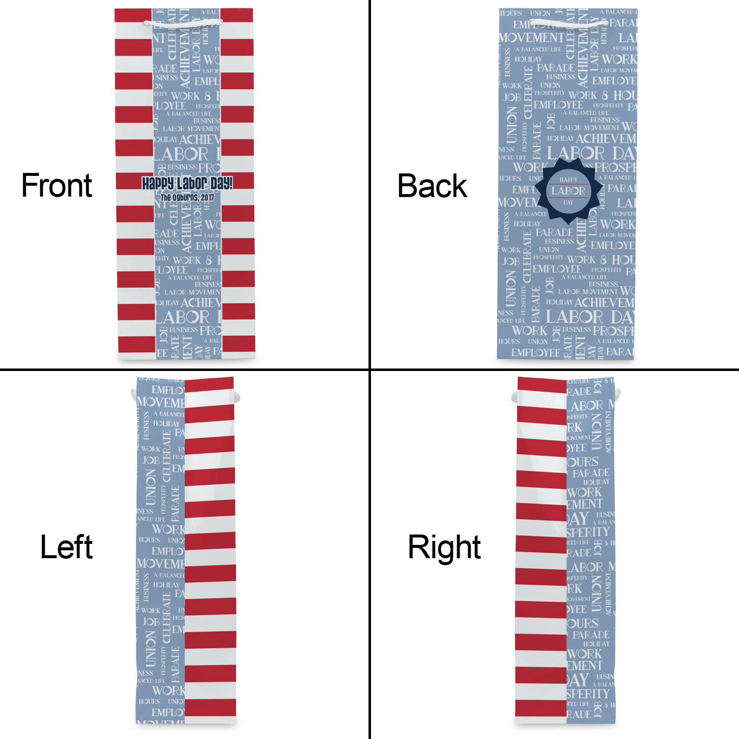 Our wine bags are printed on premium paper. The bags are then cut, scored and folded. The handles and cardstock base it attached. These custom wine bags are printed and made in the USA.