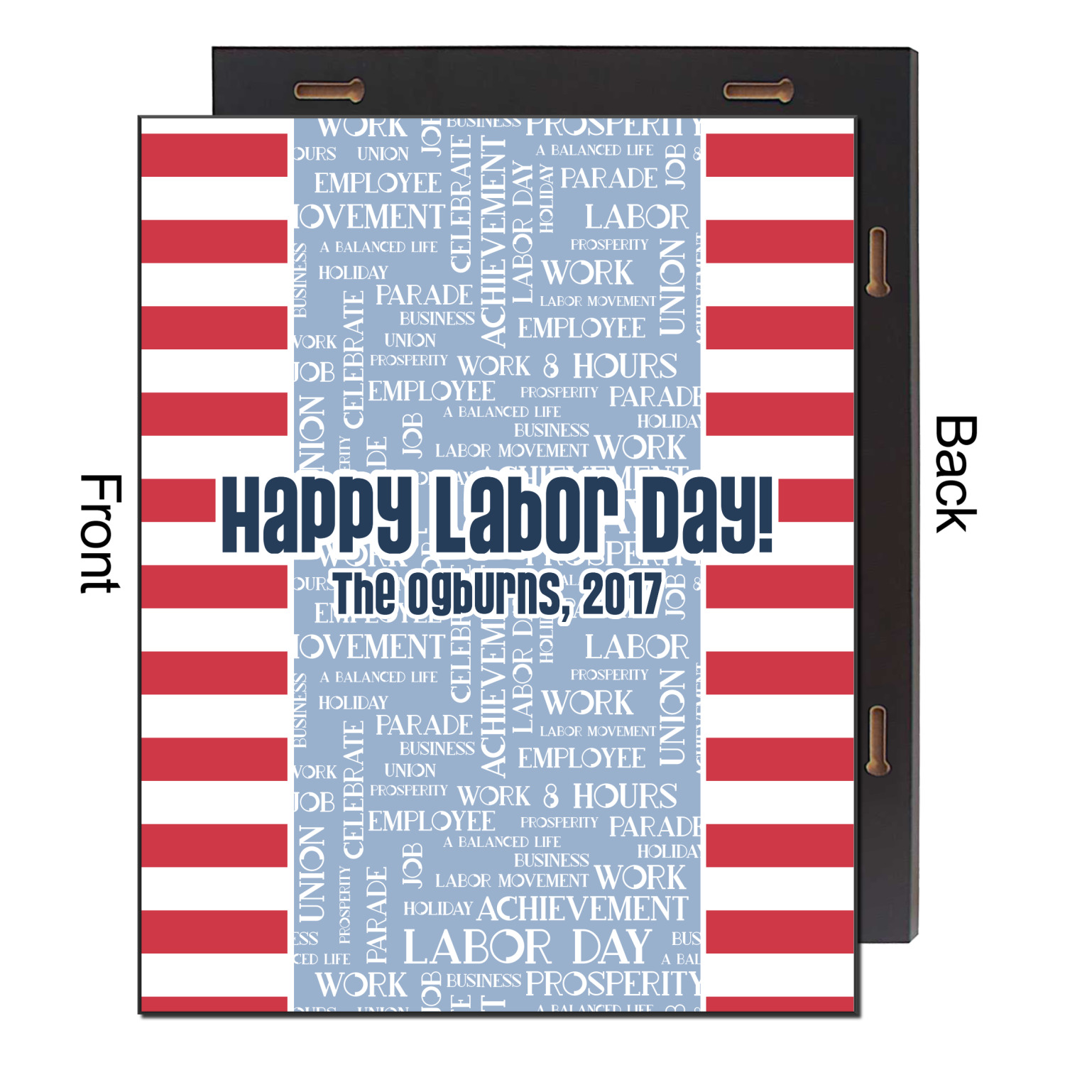 A fun red, white, and blue Labor Day badge is used in the coordinating part of the design. There are two different kinds of fonts used. One in the word cloud and one used in the personalization.