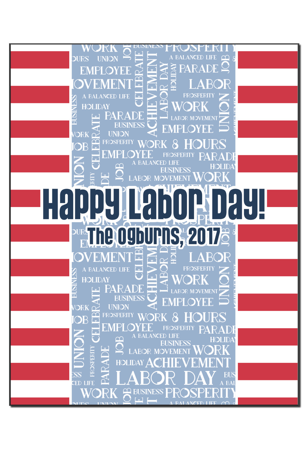 This Labor Design is a fun bright red and a subtle light blue, with white accenting all around. A red and white striped pattern is used, as well as a light blue pattern with a white word cloud on it. The word cloud pattern is a combination of themed words having to do with Labor Day, like "work," "prosperity," and "Labor Day." The red and white striped pattern is used on either side of the word cloud pattern, creating a three-part design.