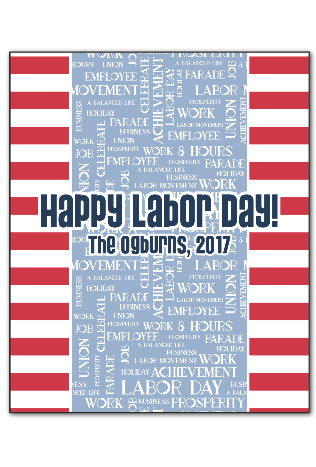 A fun red, white, and blue Labor Day badge is used in the coordinating part of the design. There are two different kinds of fonts used. One in the word cloud and one used in the personalization.