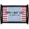 This serving tray with handles features square edges and two rounded sides, creating a very modern look. Each side is fabricated from a beautifully cut, natural wood. The bottom of the interior of the tray displays your customized design in bright, vibrant color. The tray is sold in both a black color and a natural wood look. Each variation of the wood serving tray has two sizes: Small, which is 14" x 10" x 2.25", and Large, which is 19.5" x 13.5" x 2.75".