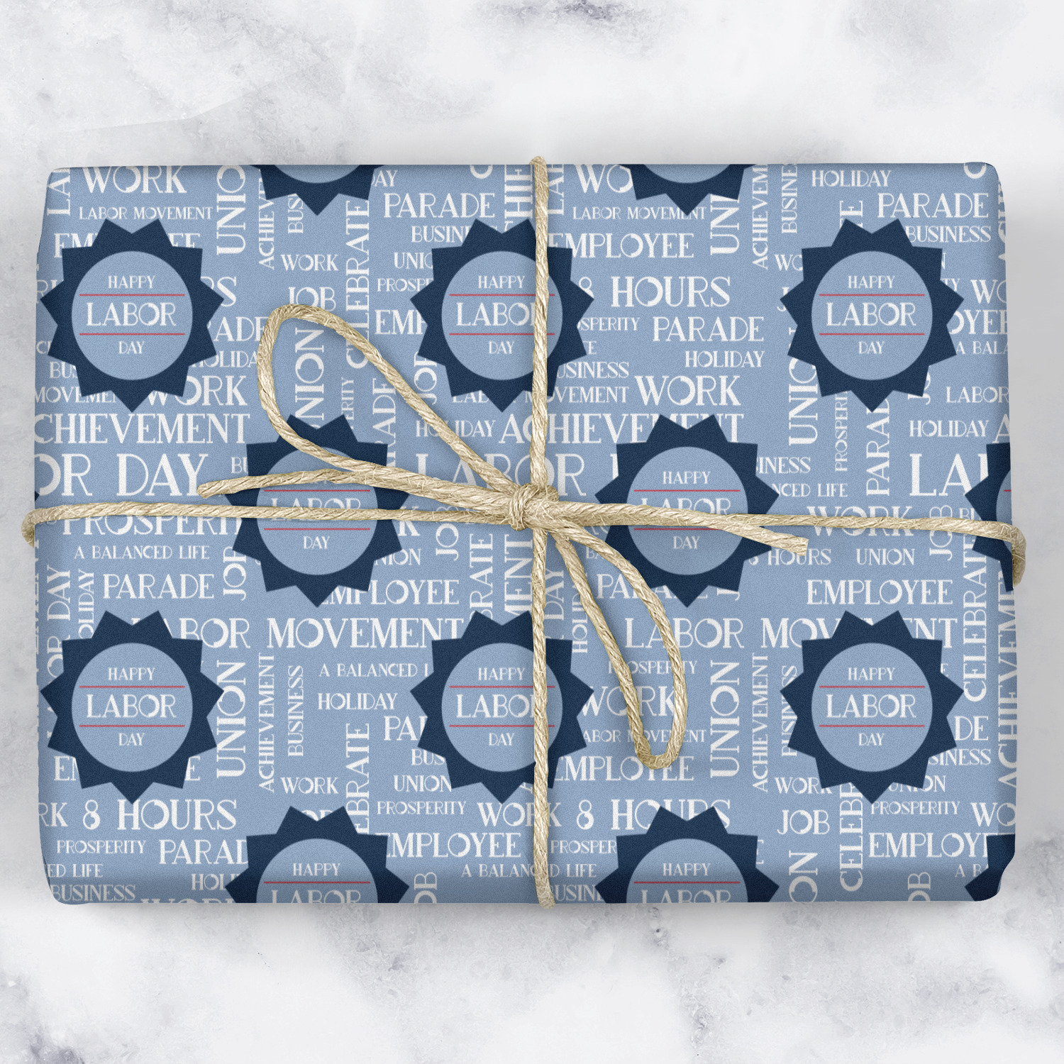 This Labor Design is a fun bright red and a subtle light blue, with white accenting all around. A red and white striped pattern is used, as well as a light blue pattern with a white word cloud on it. The word cloud pattern is a combination of themed words having to do with Labor Day, like "work," "prosperity," and "Labor Day." The red and white striped pattern is used on either side of the word cloud pattern, creating a three-part design.