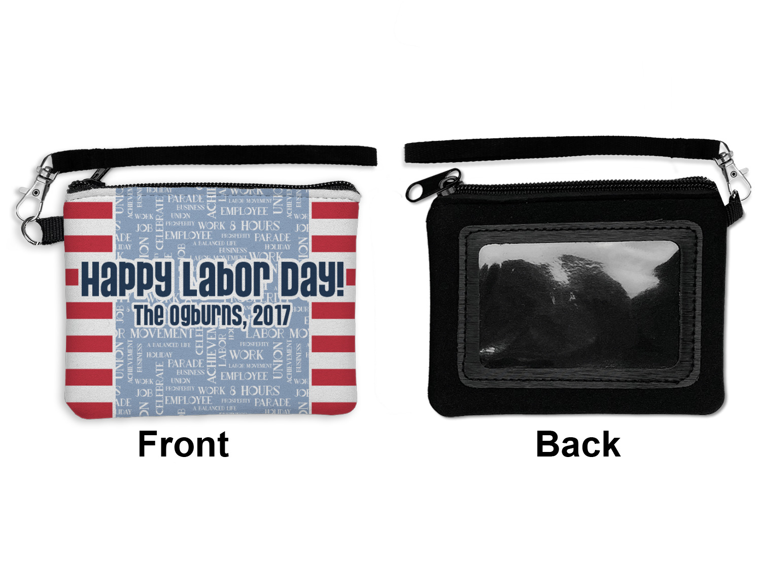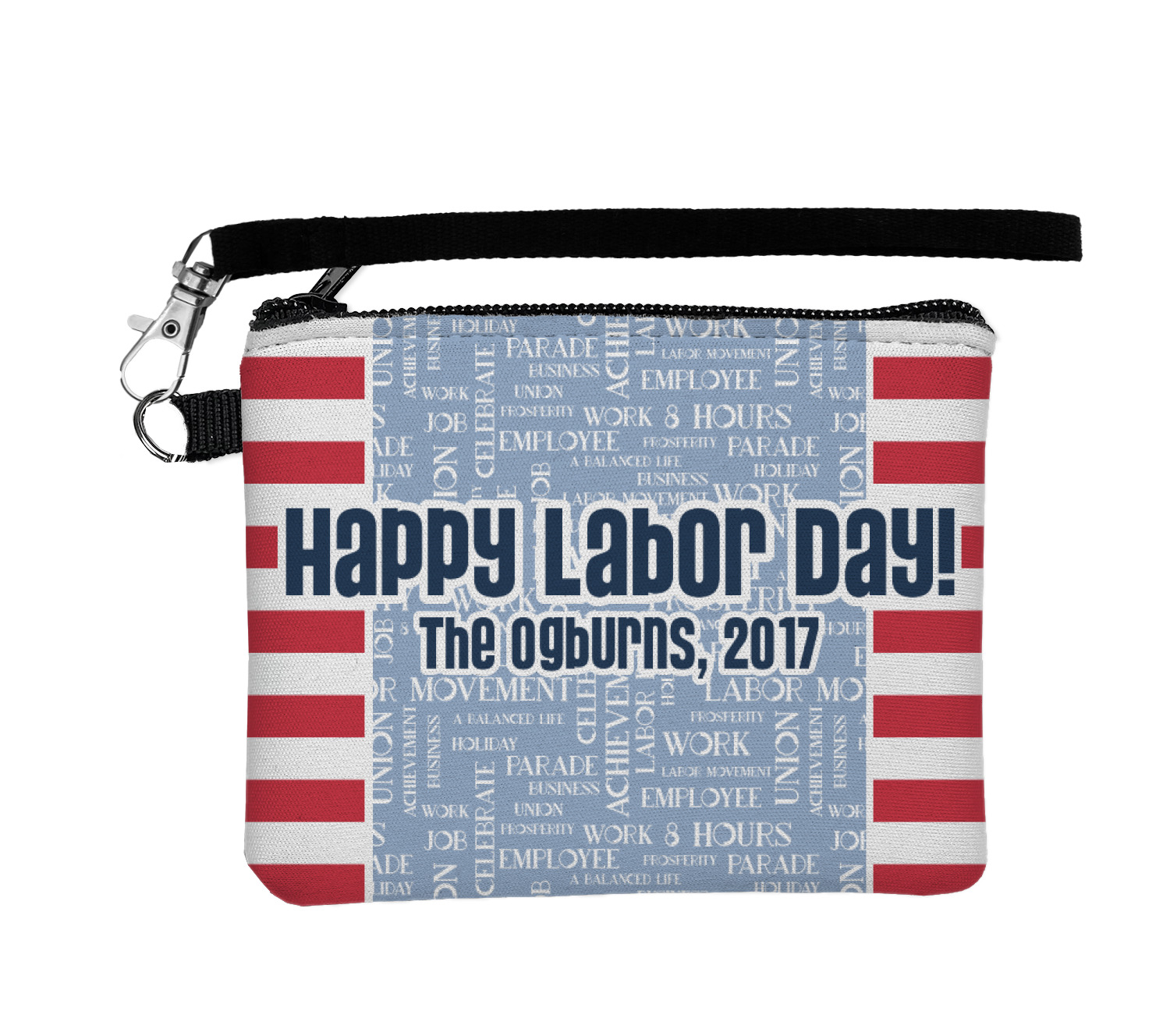 A fun red, white, and blue Labor Day badge is used in the coordinating part of the design. There are two different kinds of fonts used. One in the word cloud and one used in the personalization.