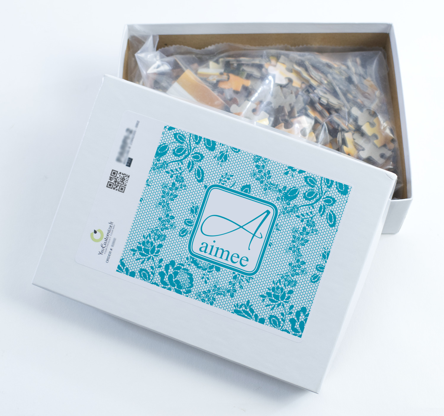 We print our puzzles on thick white chipboard in vibrant colors, then laminate the chipboard and die cut your puzzle. Your jigsaw puzzle is shipped to you in a box with the image of the puzzle on the box.