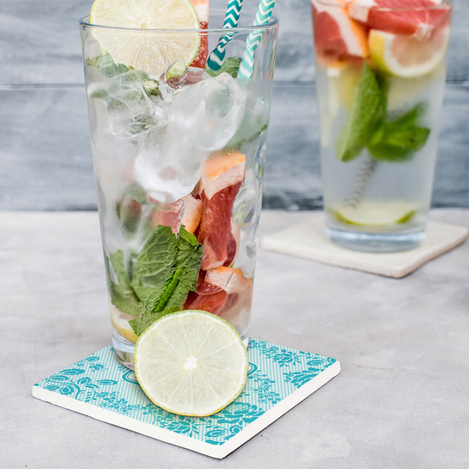 Our super absorbent stone coasters absorb the condensation into the coaster, before it has a chance to flow on to your furniture or table tops, thus preventing watermarks and blemishes.