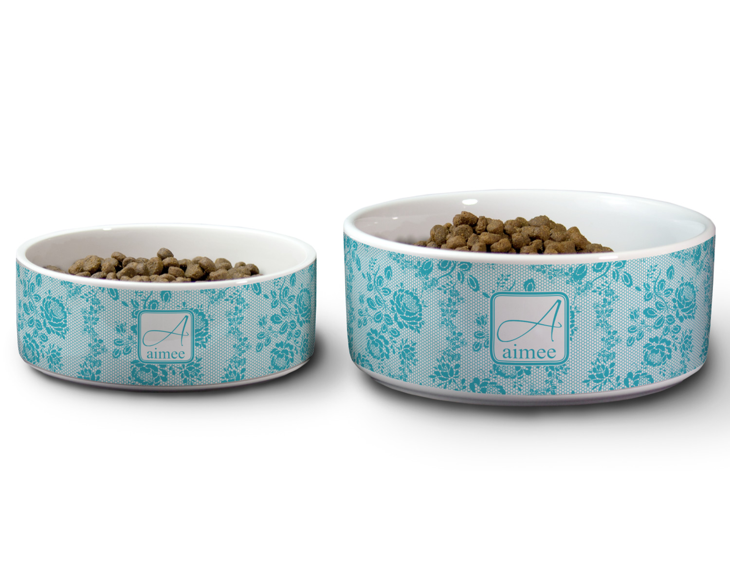 We carry these custom dog bowls in two available sizes: medium and large.The medium is 6 inches in diameter and 2.5 inches tall, and can therefore suit pets who eat up to 2.5 cups of food per meal. The large pet bowl is 7 inches in diameter and 3 inches tall, and suits pets who require up to 4.5 cups of food per meal.
