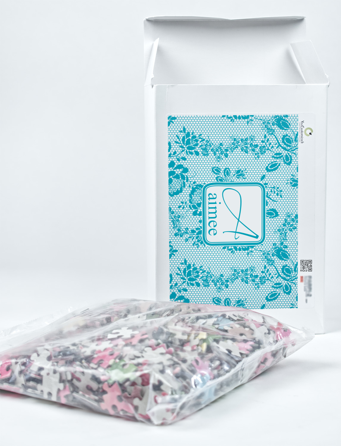 We print our puzzles on thick white chipboard in vibrant colors, then laminate the chipboard and die cut your puzzle. Your jigsaw puzzle is shipped to you in a box with the image of the puzzle on the box.