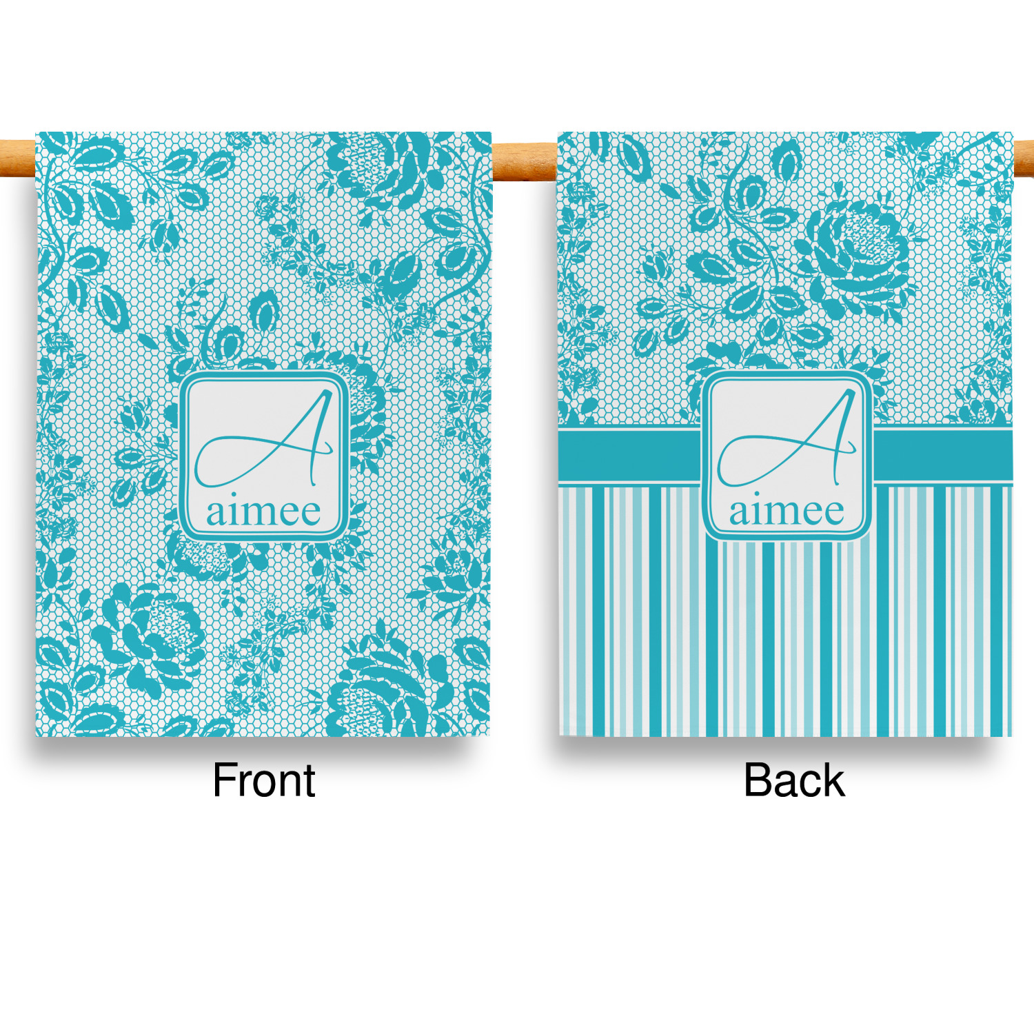 These custom garden flags are made of a durable, double-ply, polyester weave, allowing them to withstand the elements year round. The small flags measure at approximately 12 by 18 inches. The large flags measure out to 28 by 37 inches. You can order these decorative flags with your customization printed on the front only, or the front and back.